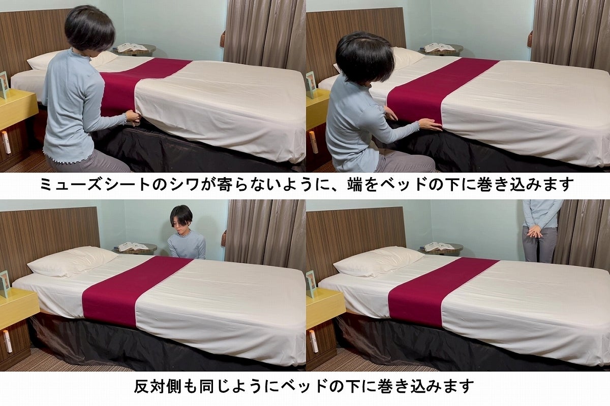 1.ミューズシート🄬の端をベッドの角に合わせ、反対側をベッドの下に入れて固定します。