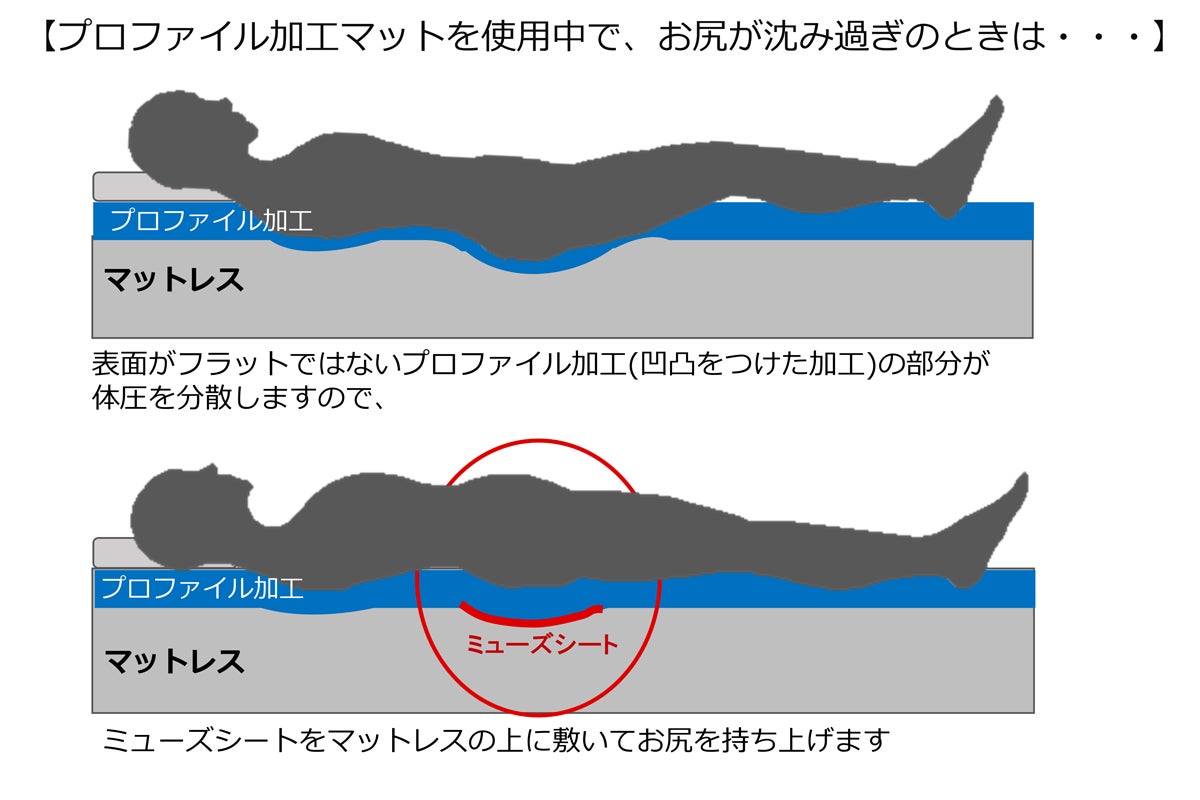 硬すぎる場合には、体圧分散を高める低反発マットやプロファイル加工マットをお使いください。