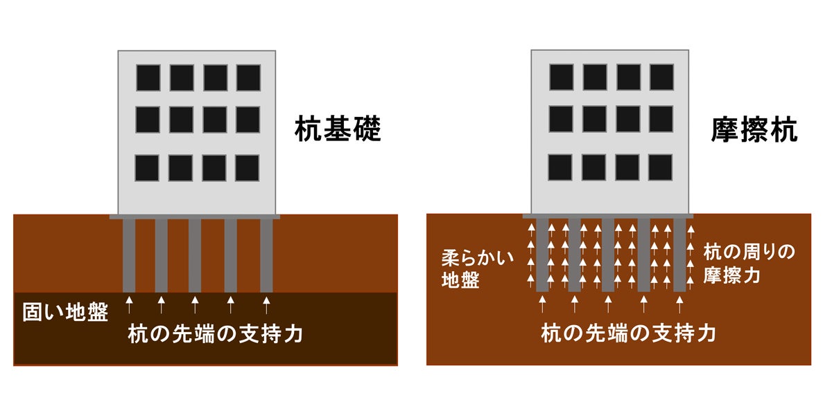 摩擦杭は、固い地盤まで届く杭基礎と違い、軟弱地盤の途中までしかありません。杭表面と土との摩擦によって、建物の重さを杭の周りの土に支えてもらう構造です。