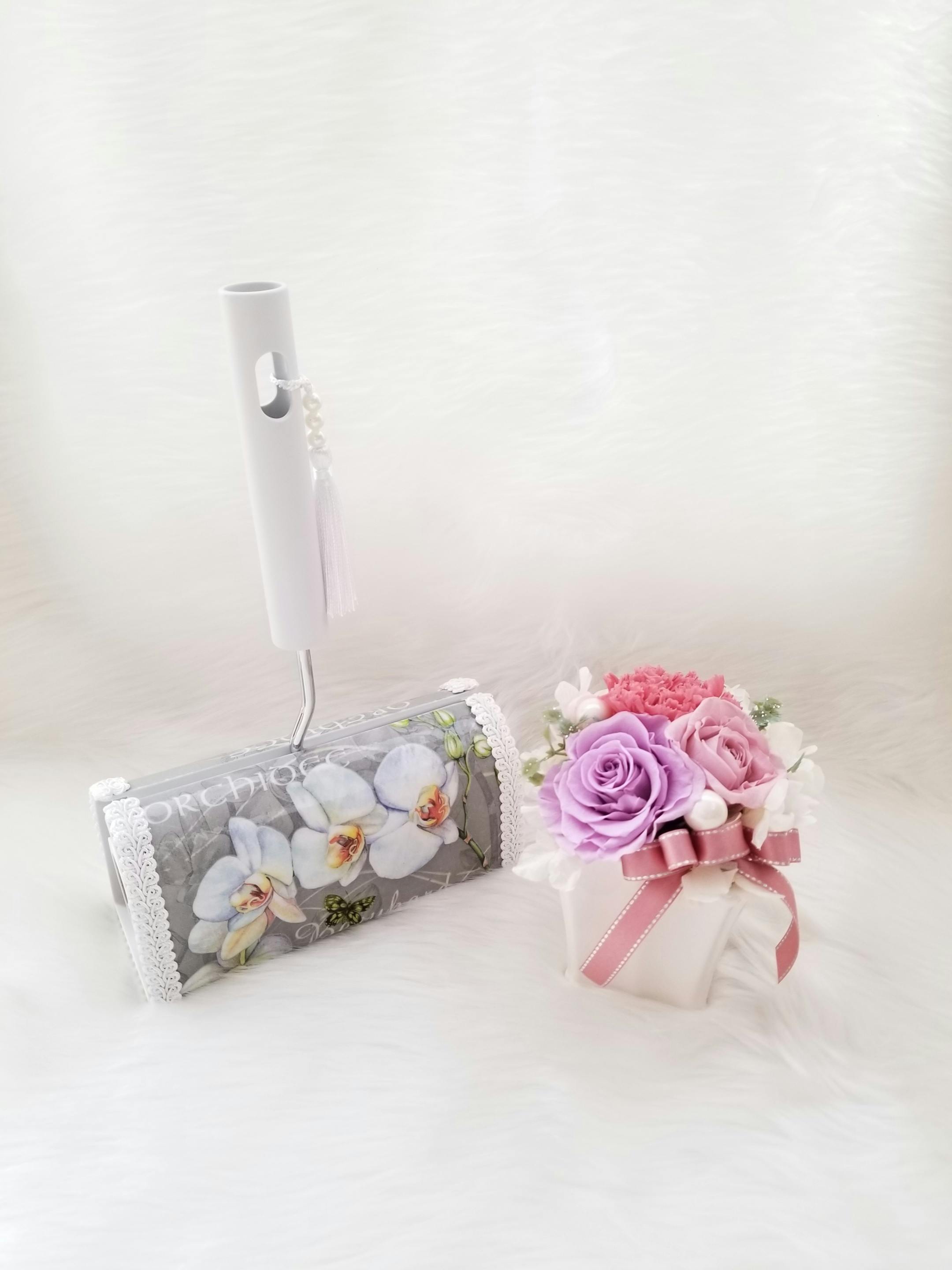 ↑お世話になった、ご年配の方へ。定番のお花のギフトと、華やかで実用性もあるクリーナーをセットで。多ジャンルのの中から組み合わせて最適な贈り物を提案させていただいております。