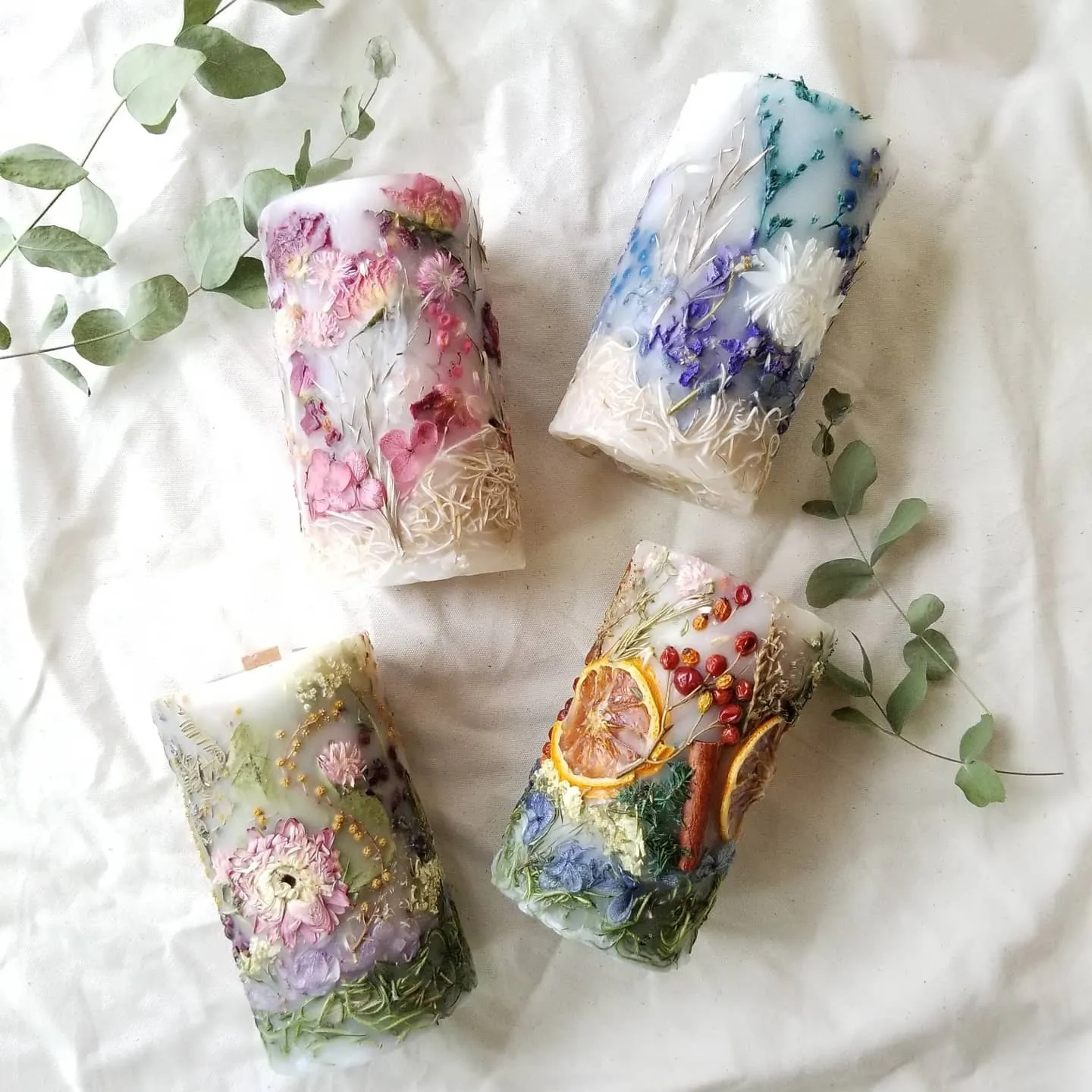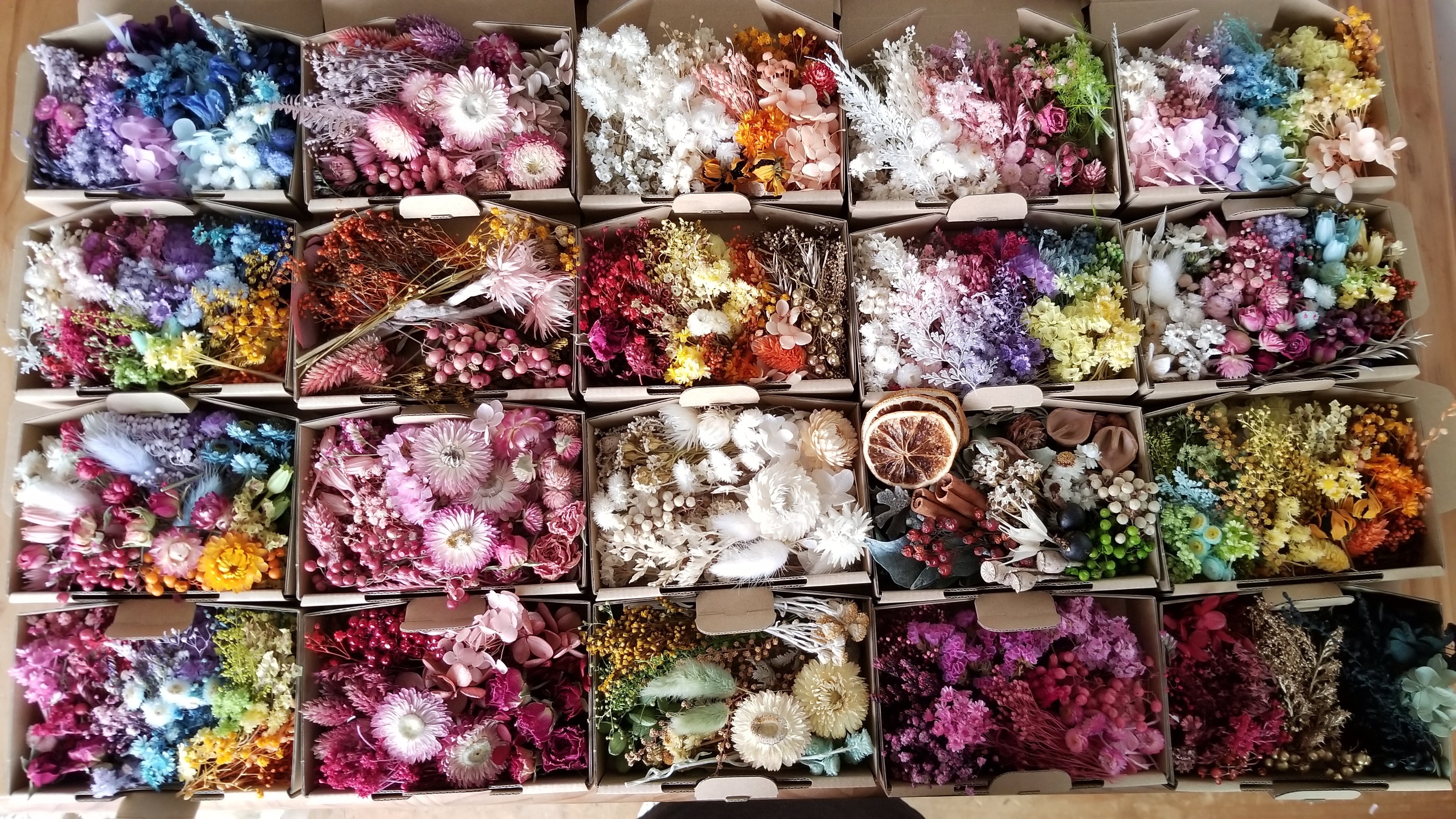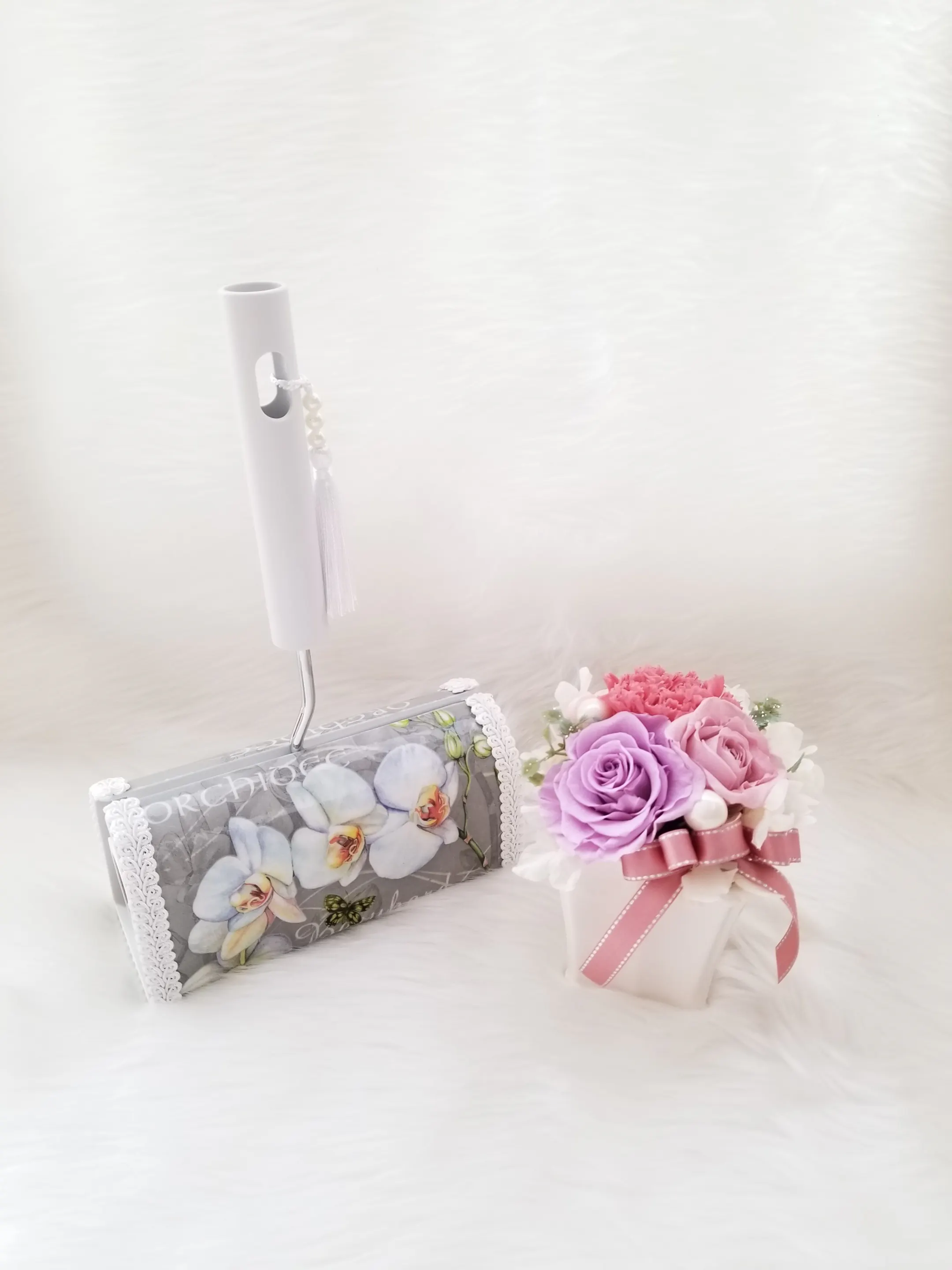 フラワーアレンジメント、自家栽培のドライフラワー、デコパージュ、アロマハイストーンの技術を組み合わせた当店だから作れるお品です。