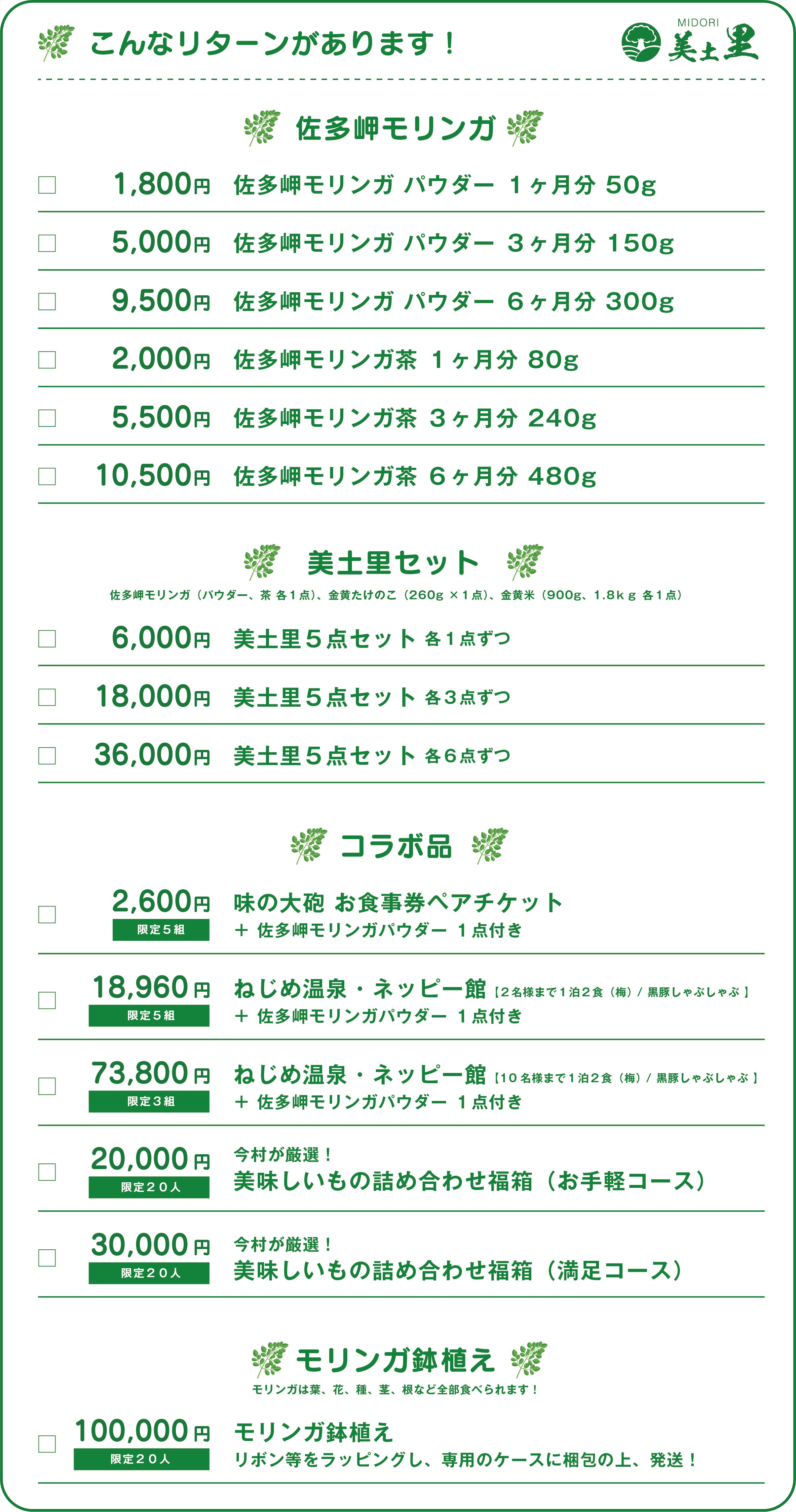 - 佐多岬モリンガのパウダー、茶から、美土里セットや鹿児島・大隅半島南大隅町とのコラボ品まで幅広く支援いただけます。