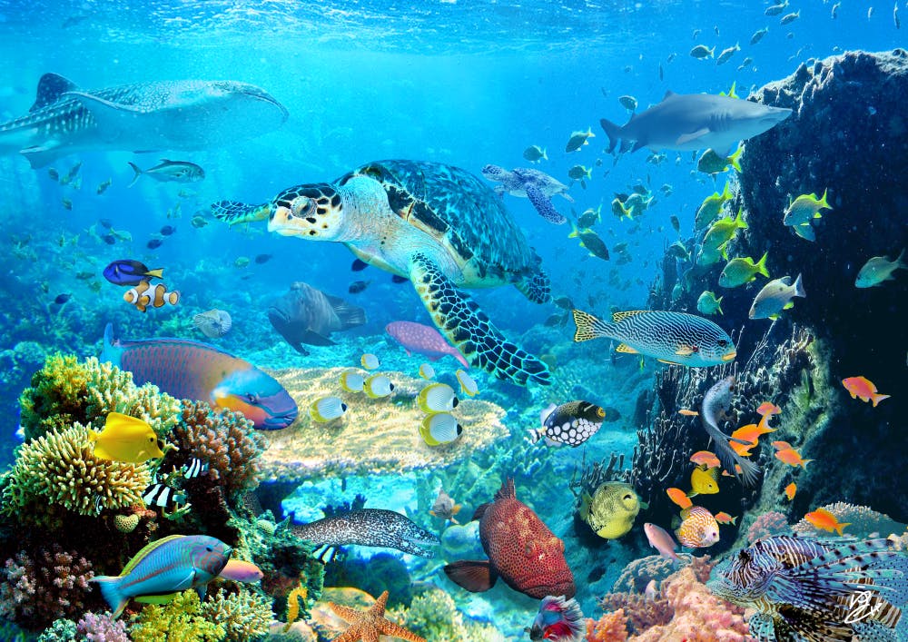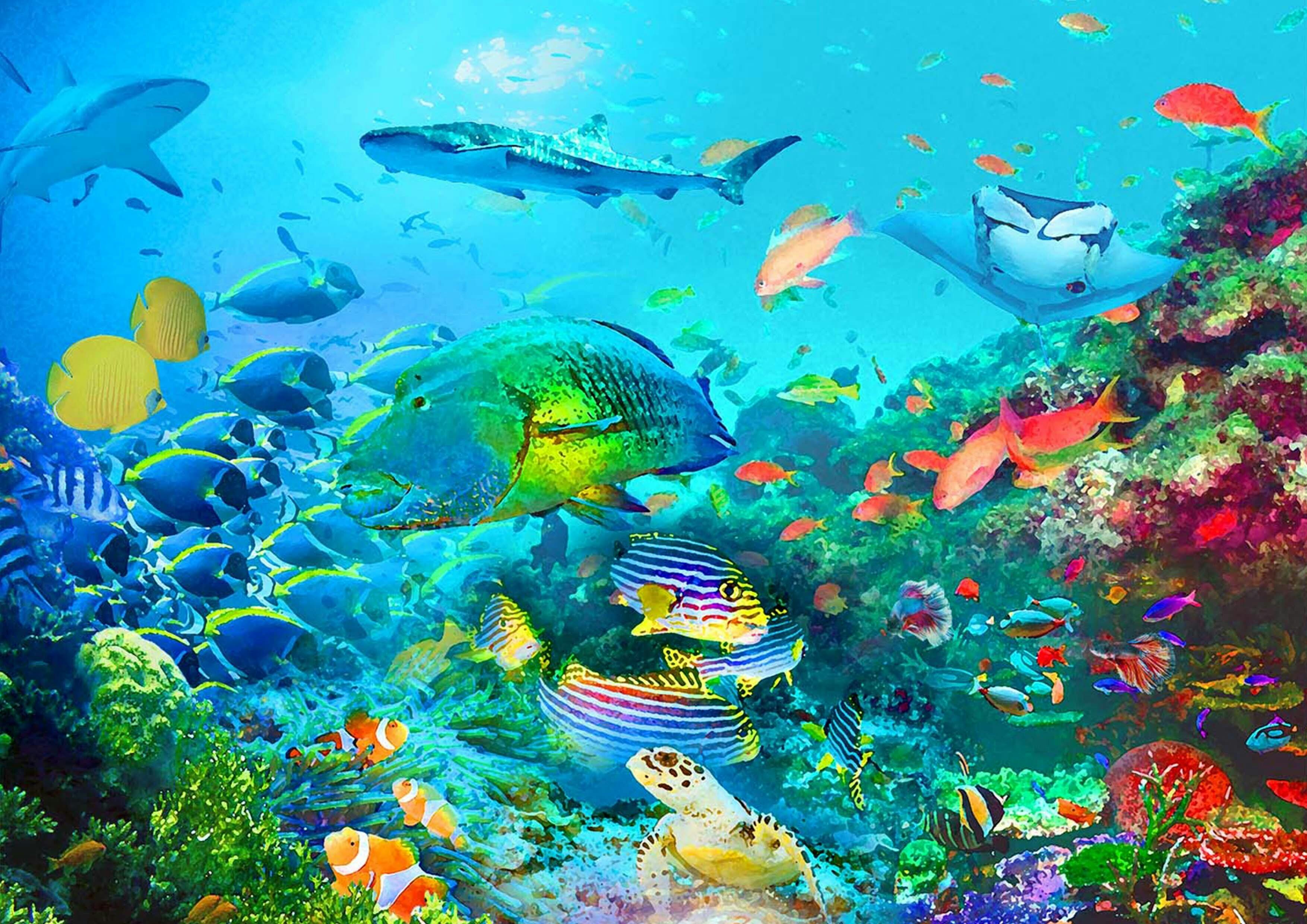 様々な魚たちが集う鮮やかな海を表現した作品です。