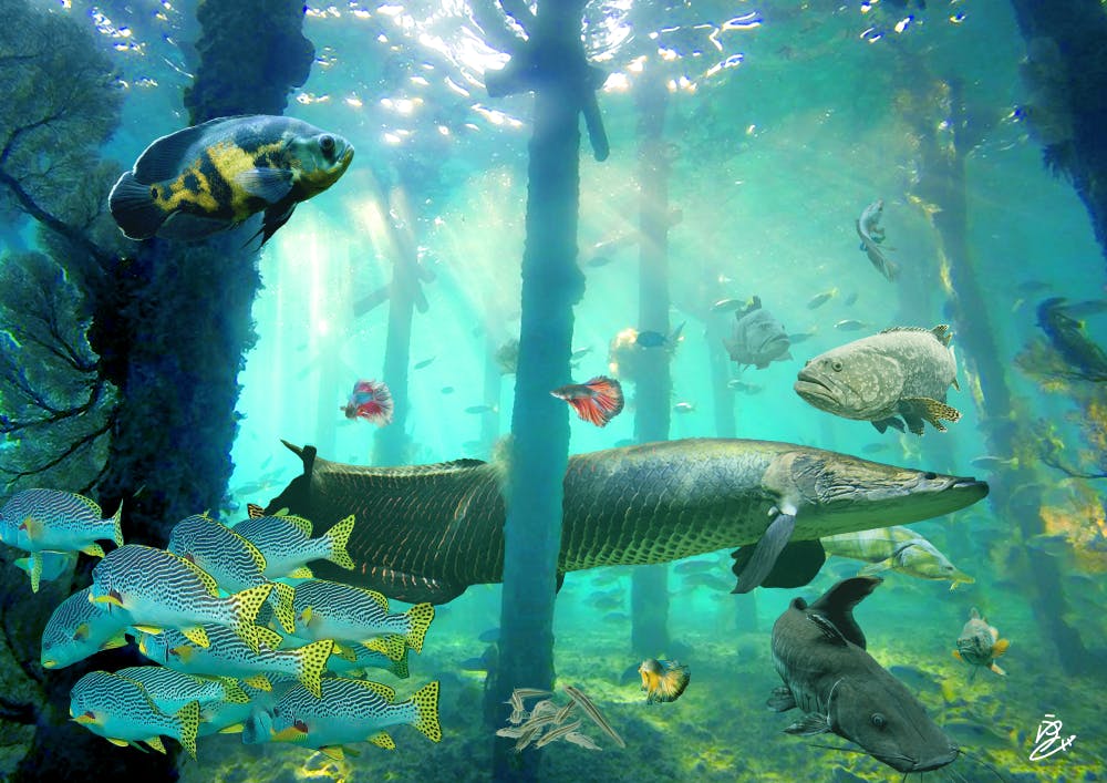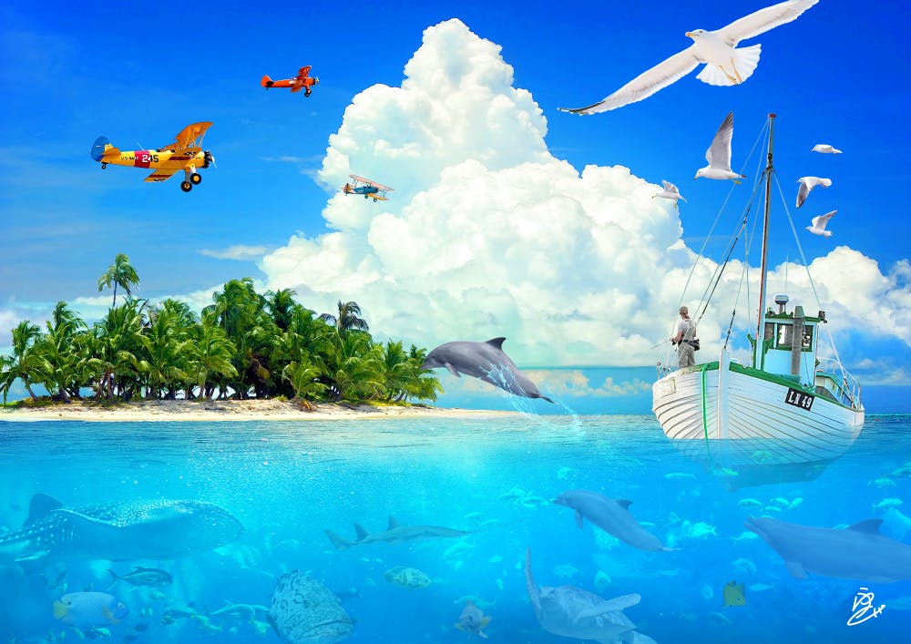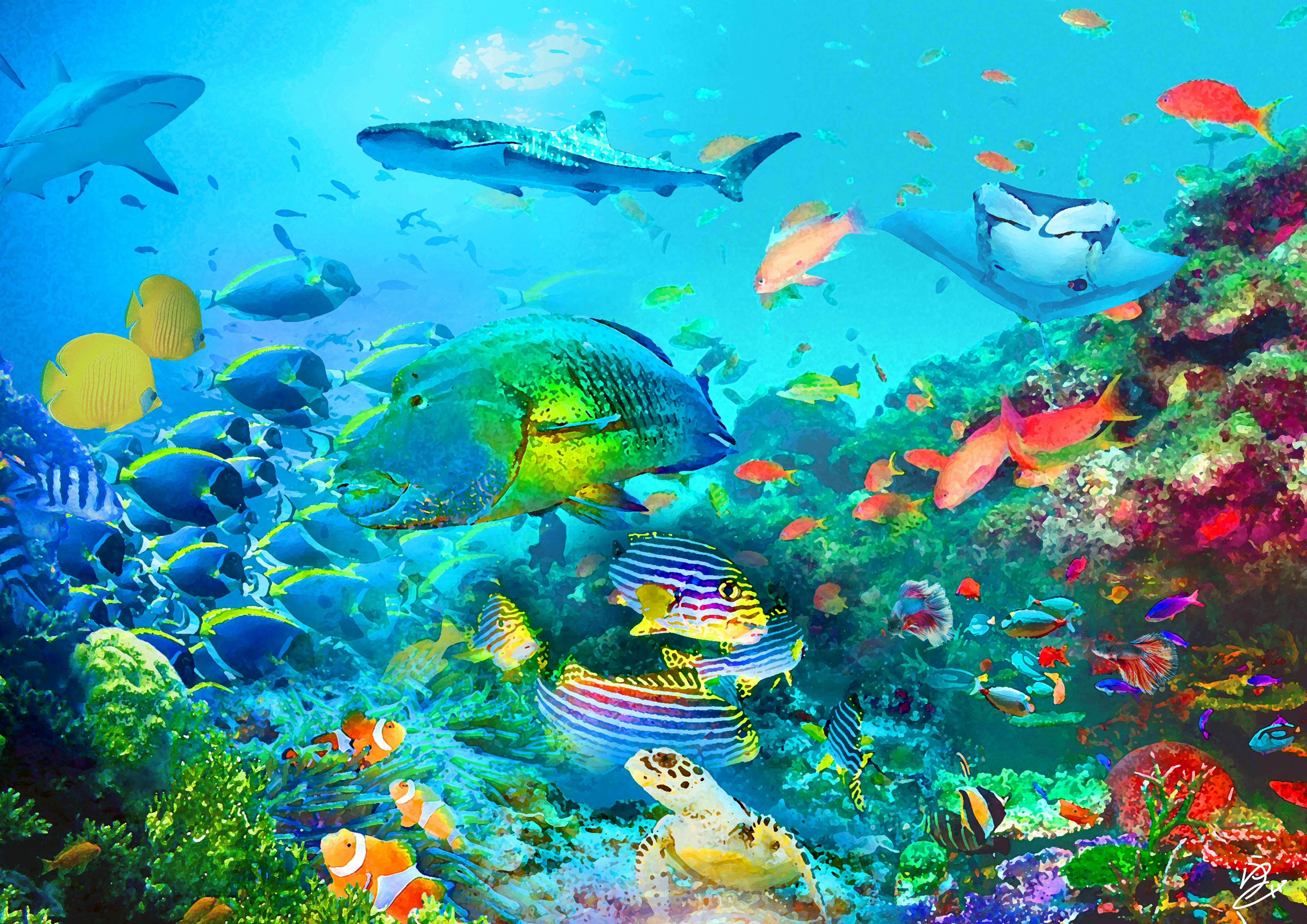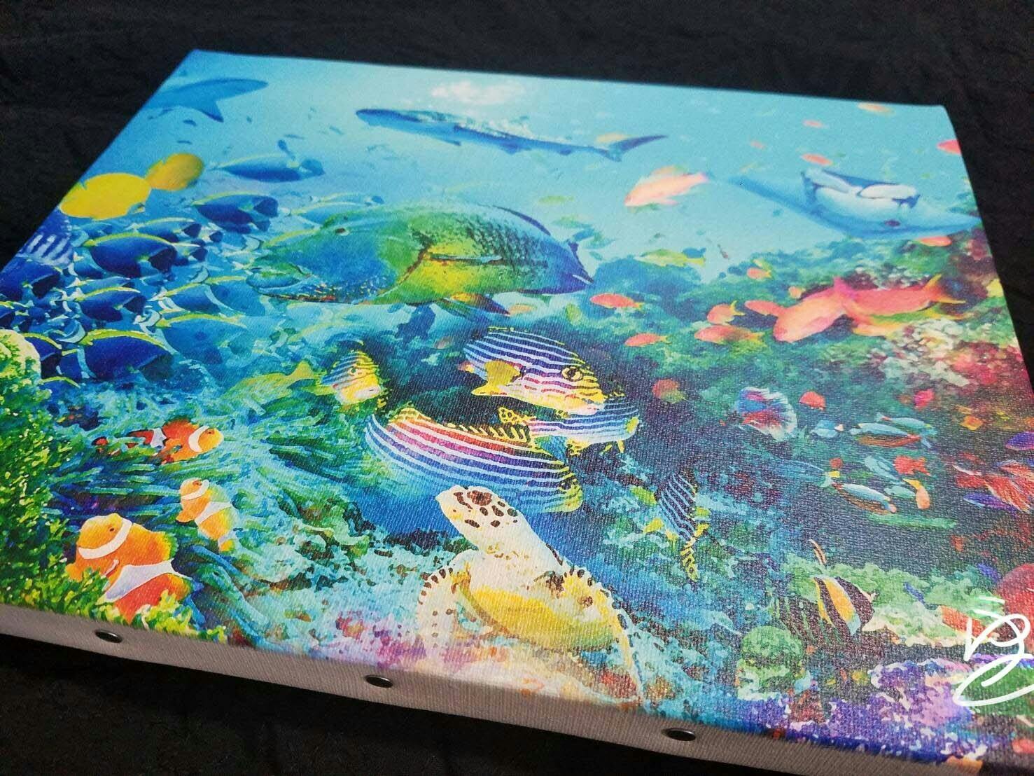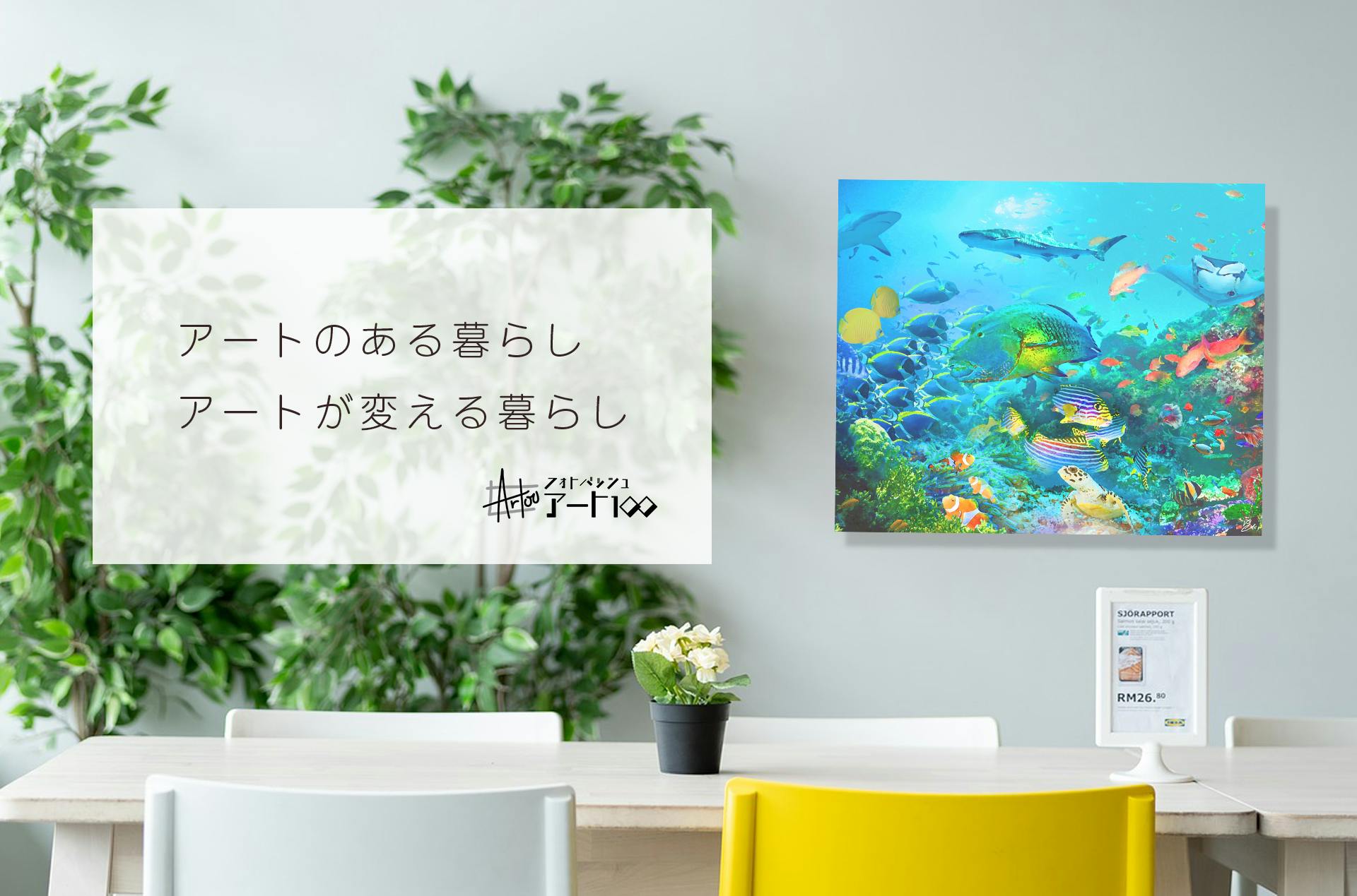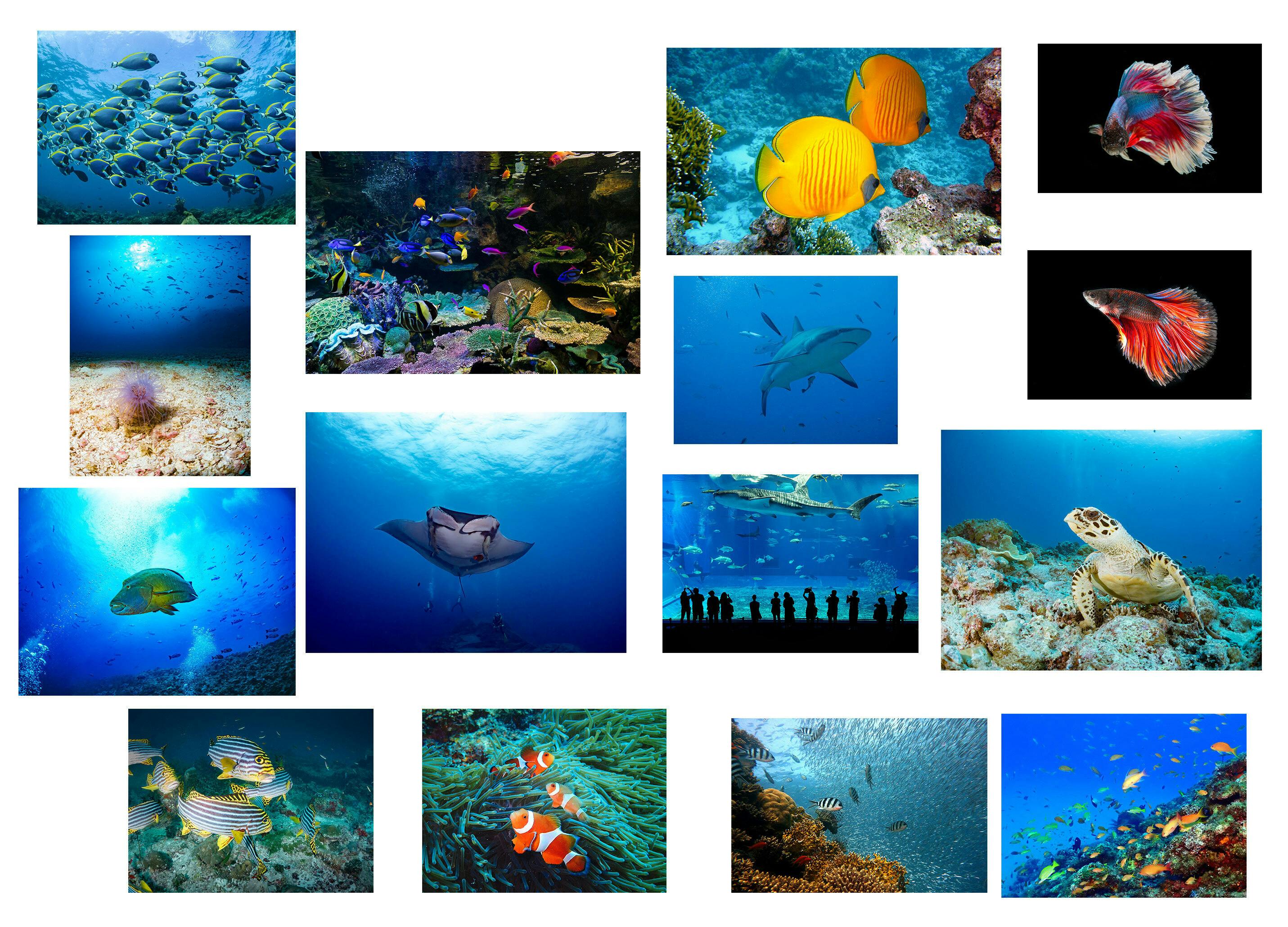 上のアート作品「オールブルー」は写真を15枚組み合わせて作っています。写真を素材として使っているので、海を泳いでいる魚たちは実際に存在する魚たちです。 想像ではなく実際の風景や生物のエッセンスが入った面白いアート作品となっています。