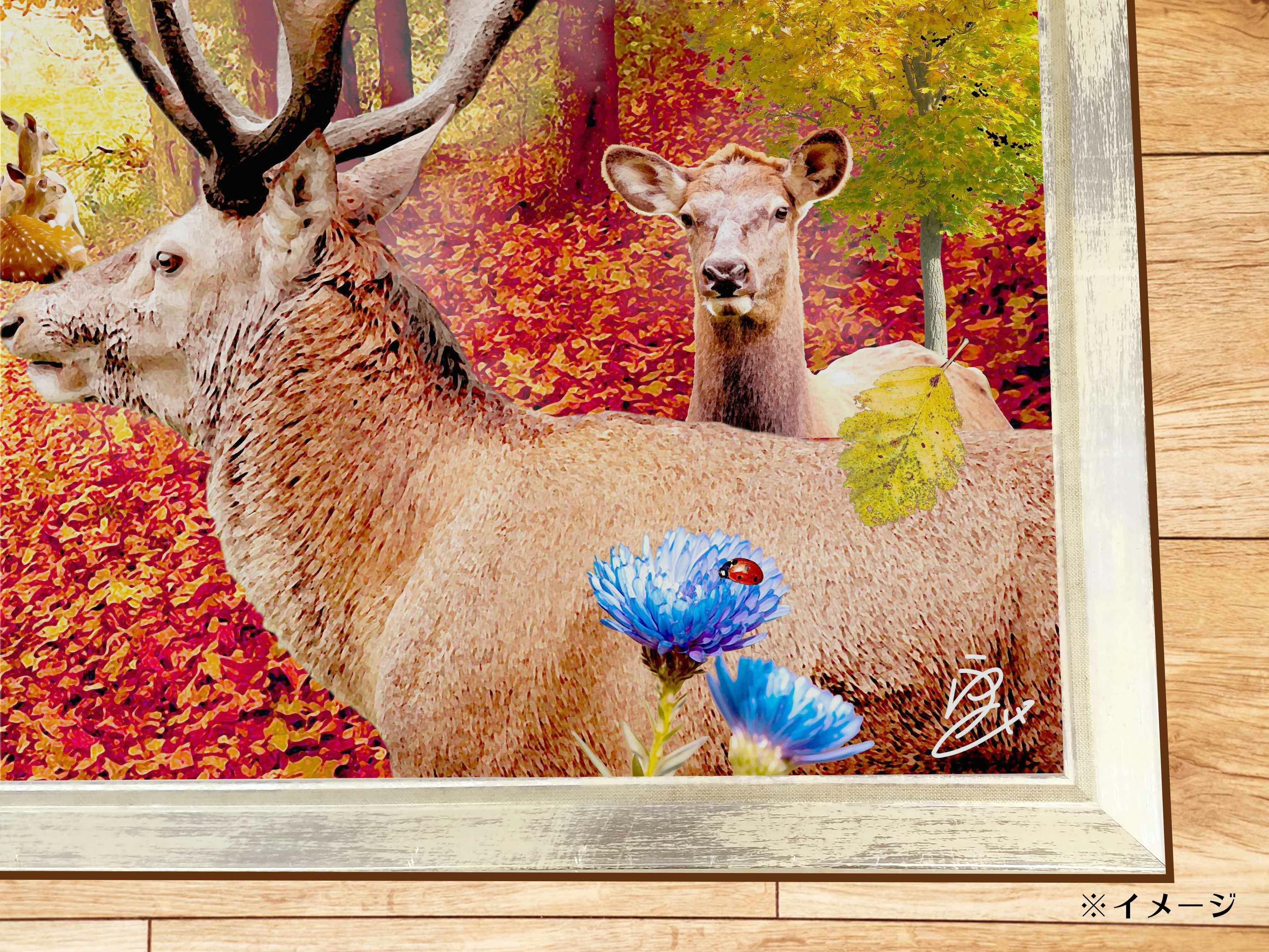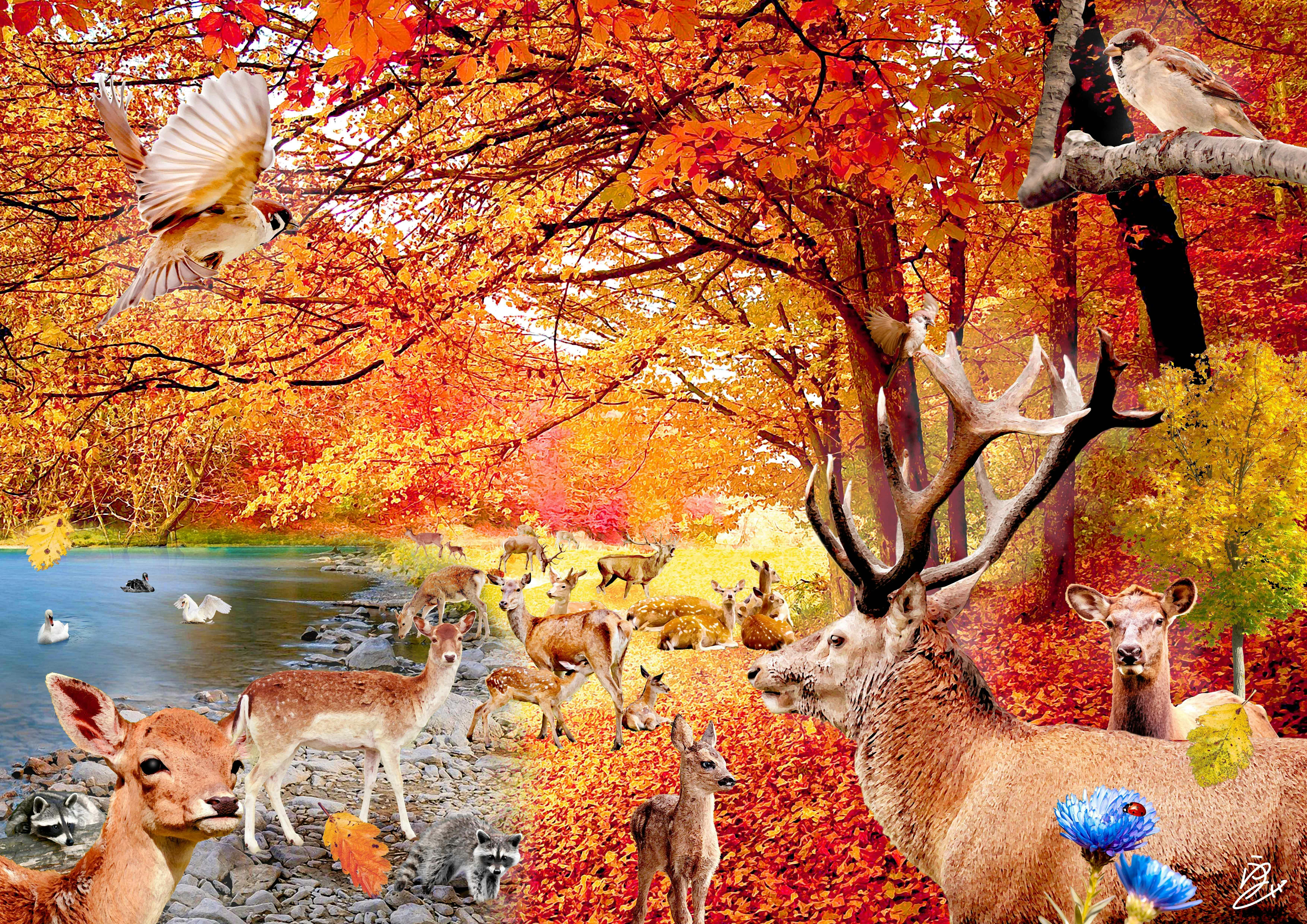 実りの秋に、鹿、アライグマ、スズメ、白鳥が集まる楽しい作品となっています。