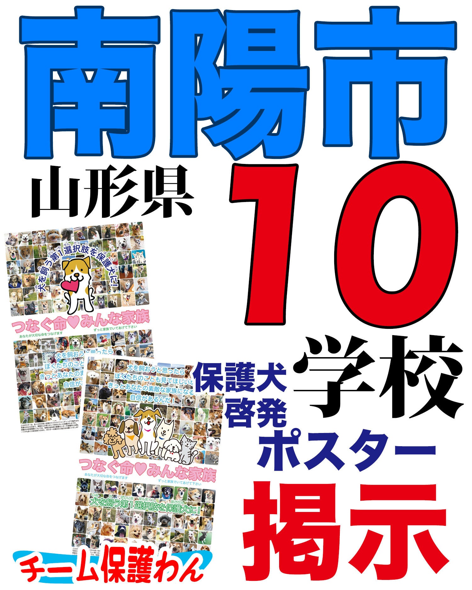 今回は、山形県の南陽市です!山形県南陽市の全小中学校、計10校に保護犬啓発ポスターを掲示して頂ける事になりました!!ポスターの掲示にあたりましては、・山形県南陽市教育委員会にご理解を頂き特別にご協力を頂きました。心より深く感謝いたします。これらのポスター掲示の実現にあたっては「チーム保護わん」が活躍しています!チーム保護わんは行政へのアプローチを行う精鋭チームです。(教育委員会からの各学校へのポスターの掲示依頼は、公的なものに限られる場合が大半ですが、本プロジェクトでは企画に対する深いご理解を頂きまして、特例的な案件としてお取り扱い頂いています。)これまでの全国47都道府県1.2万校を超える保護犬啓発ポスターの掲示実績については、保護わんのHPで発表しています。引き続き、みなさまの応援をよろしくお願い致します。*ポスターの掲示に関しては各教育委員会の承認を得て、教育委員会から各校へ依頼して頂いていますが、学校により掲示スペースの問題など、校長判断で掲示出来ないケースもありますので、ご了承下さい。