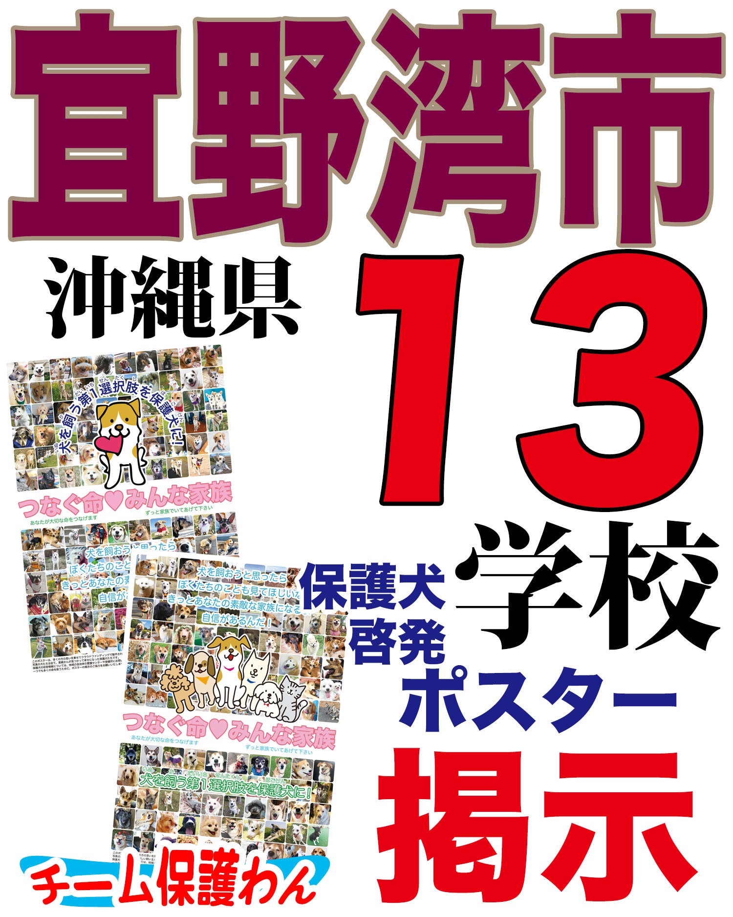 今回は、沖縄県の宜野湾市です!沖縄県宜野湾市の全小中学校等、計13校に保護犬啓発ポスターを掲示して頂ける事になりました!!ポスターの掲示にあたりましては、・沖縄県宜野湾市教育委員会にご理解を頂き特別にご協力を頂きました。心より深く感謝いたします。これらのポスター掲示の実現にあたっては「チーム保護わん」が活躍しています!チーム保護わんは行政へのアプローチを行う精鋭チームです。(教育委員会からの各学校へのポスターの掲示依頼は、公的なものに限られる場合が大半ですが、本プロジェクトでは企画に対する深いご理解を頂きまして、特例的な案件としてお取り扱い頂いています。)これまでの全国47都道府県1.2万校を超える保護犬啓発ポスターの掲示実績については、保護わんのHPで発表しています。引き続き、みなさまの応援をよろしくお願い致します。*ポスターの掲示に関しては各教育委員会の承認を得て、教育委員会から各校へ依頼して頂いていますが、学校により掲示スペースの問題など、校長判断で掲示出来ないケースもありますので、ご了承下さい。