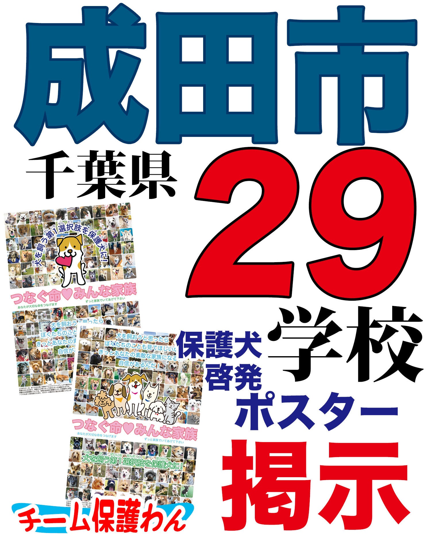 今回は、千葉県の成田市です!千葉県成田市の全小中学校等、計29校に保護犬啓発ポスターを掲示して頂ける事になりました!!ポスターの掲示にあたりましては、・千葉県成田市教育委員会にご理解を頂き特別にご協力を頂きました。心より深く感謝いたします。これらのポスター掲示の実現にあたっては「チーム保護わん」が活躍しています!チーム保護わんは行政へのアプローチを行う精鋭チームです。(教育委員会からの各学校へのポスターの掲示依頼は、公的なものに限られる場合が大半ですが、本プロジェクトでは企画に対する深いご理解を頂きまして、特例的な案件としてお取り扱い頂いています。)これまでの全国47都道府県1.2万校を超える保護犬啓発ポスターの掲示実績については、保護わんのHPで発表しています。引き続き、みなさまの応援をよろしくお願い致します。*ポスターの掲示に関しては各教育委員会の承認を得て、教育委員会から各校へ依頼して頂いていますが、学校により掲示スペースの問題など、校長判断で掲示出来ないケースもありますので、ご了承下さい。