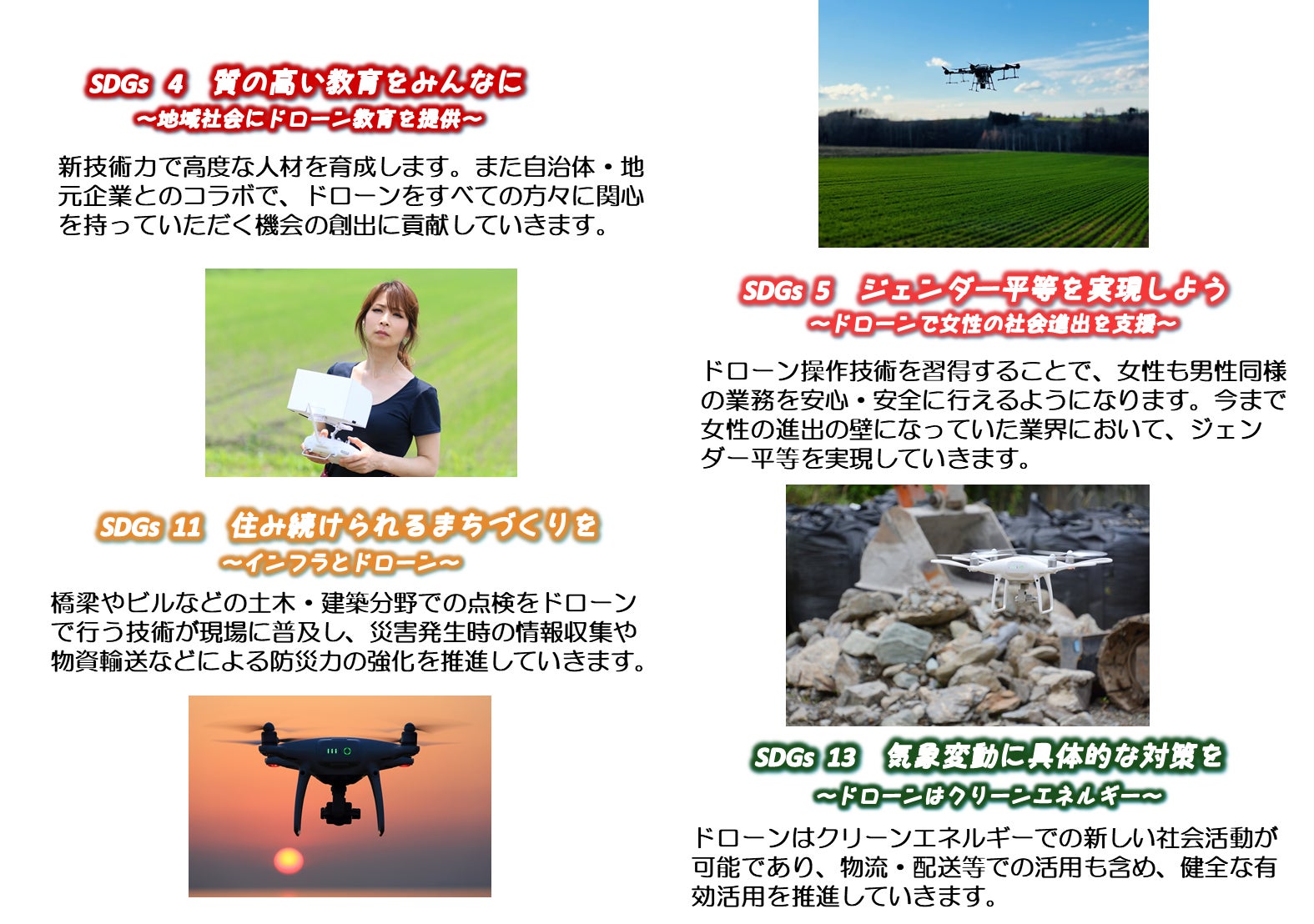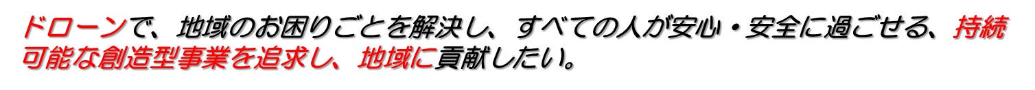 『すなわち、地元人材育成/確保を目標とし、地元企業がドローンを活用し、各分野に事業参入できる環境を構築する。地域とともにSDGsの理念で持続可能な地域を目指したい。』 という思いでこのプロジェクトを推進いたします。