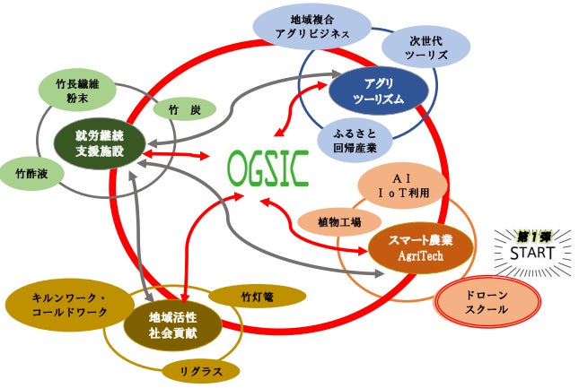 本年、株式会社OGSICファームをまず立ち上げ、ドローンスクールを開講し、そのことを「点」(各ブランド構築)とし、「点」 を増やし、「点」が連携することで「線」になります。そして、特定の点が全て連携することにより最適化の「面」になります。地域経済の活性化とは、それぞれの場所で生み出される財・サービスの付加価値が大きくなることだけを指すのではない。人々の社会経済活動における関係・交流の密度もまた、重要な要素(ブランディング)だと感じる。