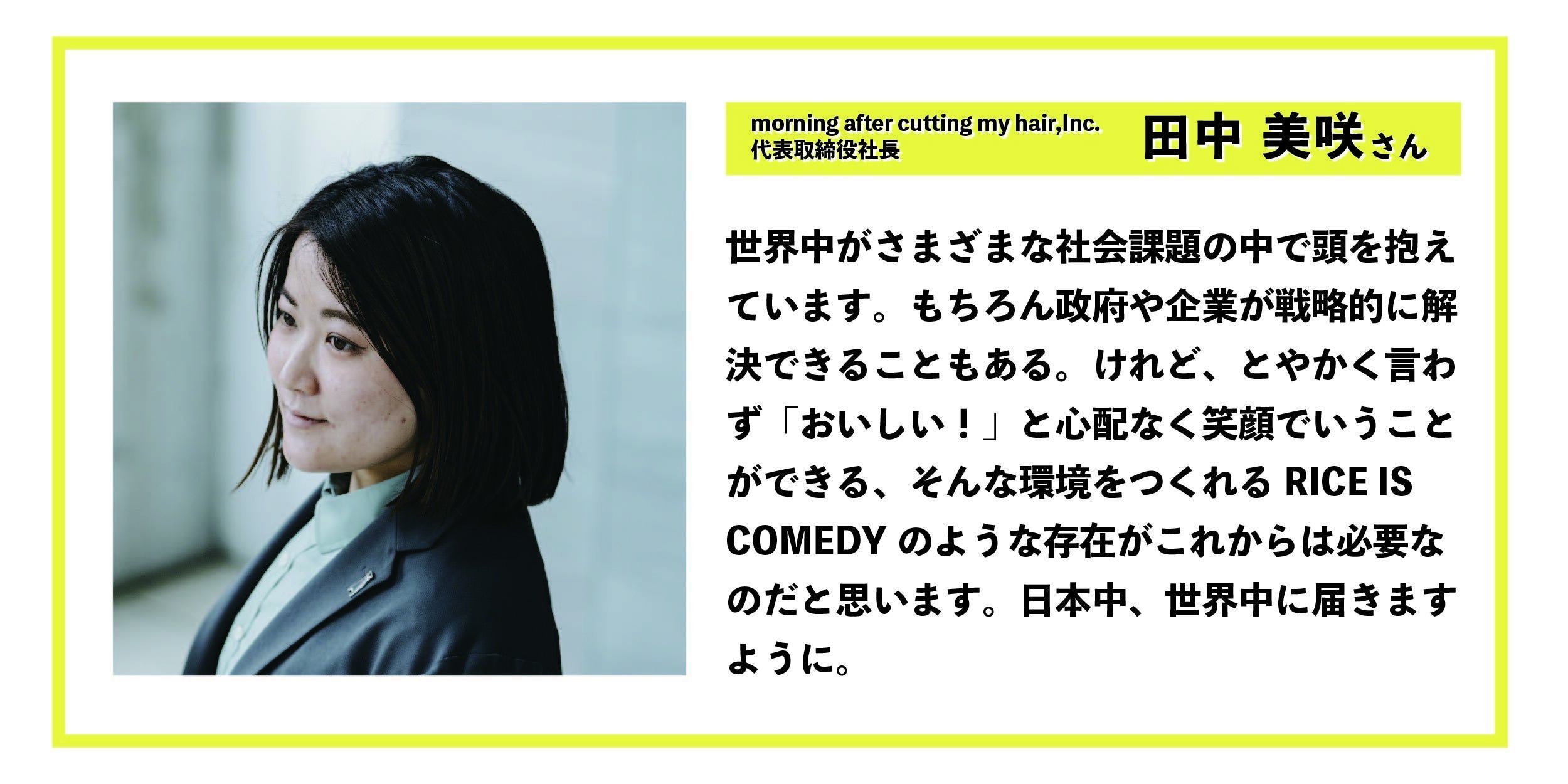 こうした活動を経て、地域のネガティブをポジティブに変えていきたいという思いが強まり、ネガティブに隠れていて気づかなかったけれど、実は地域の武器になる、魅力あるものだと目に止まったのが「農業」でした。地域の農業には課題が山ほどあり、そこに一石を投じられないかと「RICE IS COMEDY(米作りは喜劇だ)」というコンセプトを掲げ、実際にお米づくりを始めました!