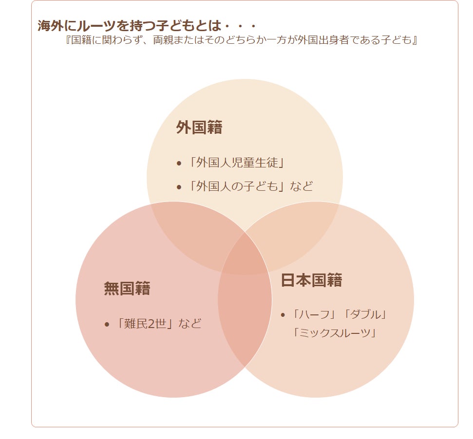 近年、テレビや新聞等のメディアでも、海外ルーツの子どもたちが日本の学校で学ぶ様子などをよく見かけるようになりました。「海外にルーツを持つ子ども」とは、外国籍の子どもだけでなく、保護者が外国出身者である日本国籍の子どもや、難民などで無国籍状態にある子どもも含まれています。