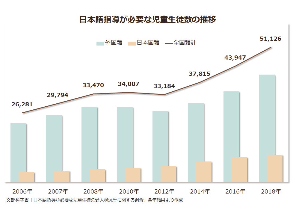 日本の公立学校には、日本語がわからず困っている児童生徒が5万1千以上在籍しています。2018年までの10年で1.5倍となり、メディアなどでその存在が取り上げられる機会も増えました。