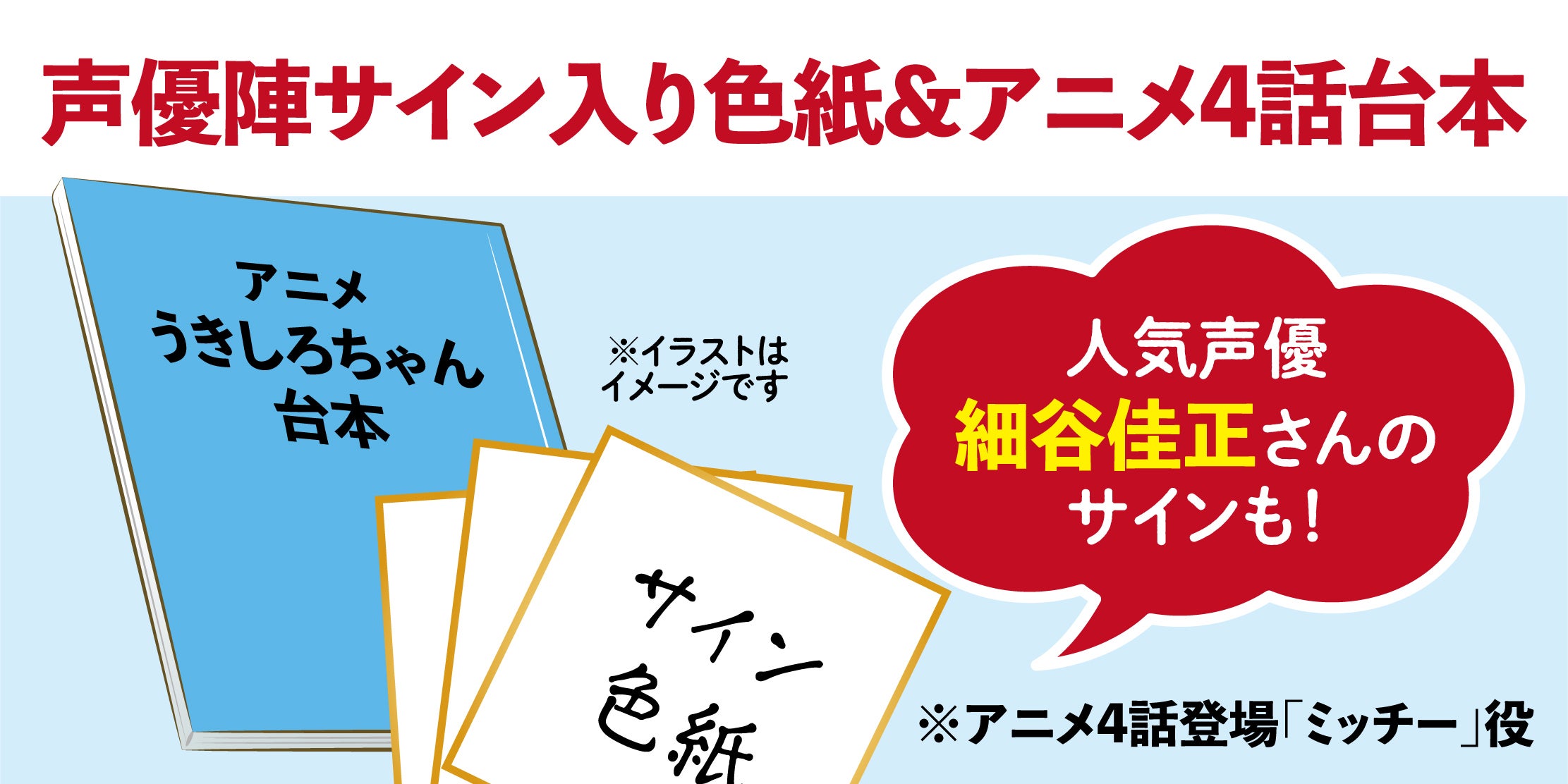 主人公のうきしろちゃん、まるちゃん、のぼ様、ミッチーの声優陣のサインが入った色紙・サイン台本をお届けします!