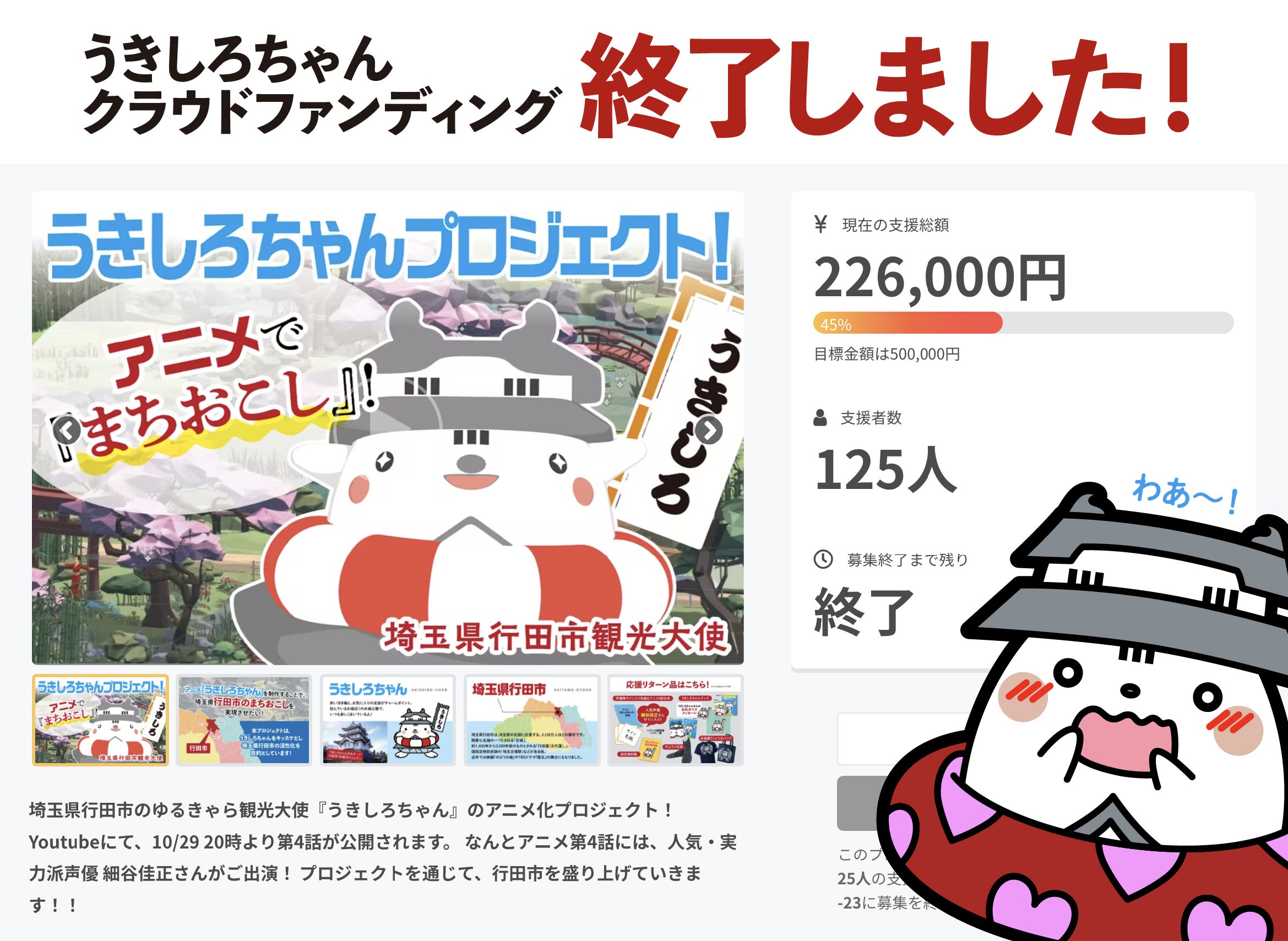 2021/12/24 11:18アニメで『まちおこし』!埼玉県行田市観光大使『うきしろちゃん』プロジェクト!当クラウドファンディングは、12/23(木)をもちまして終了いたしました!期間中、応援してくださった方々、そしてご支援いただいた方々。本当にありがとうございました!*** ご支援者様へ ***この度は、埼玉県行田市のゆるきゃら観光大使『うきしろちゃん』のクラウドファンディングプロジェクトにご支援いただき、誠にありがとうございました。■ご支援総額:226,000円■ご支援者数:125名■目標達成率:45%多くの皆さまのご支援により、目標金額の約半分を達成することができました!達成目標の半分の金額とはなりましたが、今回お預かりしたご支援金は当初の予定と変わらず「行田市のPR」につながる活動へと大切に繋いでいきたいと存じます。*** リターン品の発送について ***ご支援者様への各リターン品の発送は、2022年2月下旬頃を予定しております。■500円プランをご支援いただいた方ご登録いただいたメールアドレス宛に、お礼ボイスメッセージが視聴できるURLが届きます。URLにアクセスし、お礼ボイスをお楽しみください。■1,000円〜50,000円プランをご支援いただいた方ご登録いただいた住所宛に、リターン品をお届けします。※発送前の事前通知はございません。また、お届けの日時指定もできませんのでご了承ください。※個人情報の取り扱いについて:ご支援にあたりご提供いただいた個人情報は、本クラウドファンディングのリターン品発送以外には使用いたしません。*** さいごに ***埼玉県行田市で生まれたうきしろちゃんが2012年より活動を始めて、来年で10年目を迎えます。忍城をモチーフとしたキャラクターとして、「うきしろちゃんを通じて行田市に詳しくなった!」「実際に行田に訪れてみた!」とのお声を糧に日々活動をしておりました。また2019年からはCV(キャラクターボイス)もつくようになり、地域と密着したVチューバーとしての動画投稿やアニメ、リアルイベントでも着ぐるみMC担当として参加するなど、さらに活動の幅を広げました。今回のクラウドファンディングでは、以前より応援してくださっているファンの方に加え、新たなファンをお迎えすることができました。ご支援者のみならず、Twitter・FacebookといったSNSや、お電話・メールなどで数多くの方からの応援をいただき、うきしろちゃんをはじめ、事務局一同、身が引き締まる思いでいっぱいです。これからも「うきしろちゃん」が生まれた地、埼玉県行田市を、うきしろちゃんなりの活動で盛り上げていきたいと意志を新たにいたしました。どうぞ、これからもうきしろちゃんを応援していただけますと幸いです。※活動報告によるメール受信を希望されない方へ受信メール内にある「メール通知設定」にアクセスし、[通知を受け取らない]にチェックを入れ、[変更]を押してください。 もっと見る