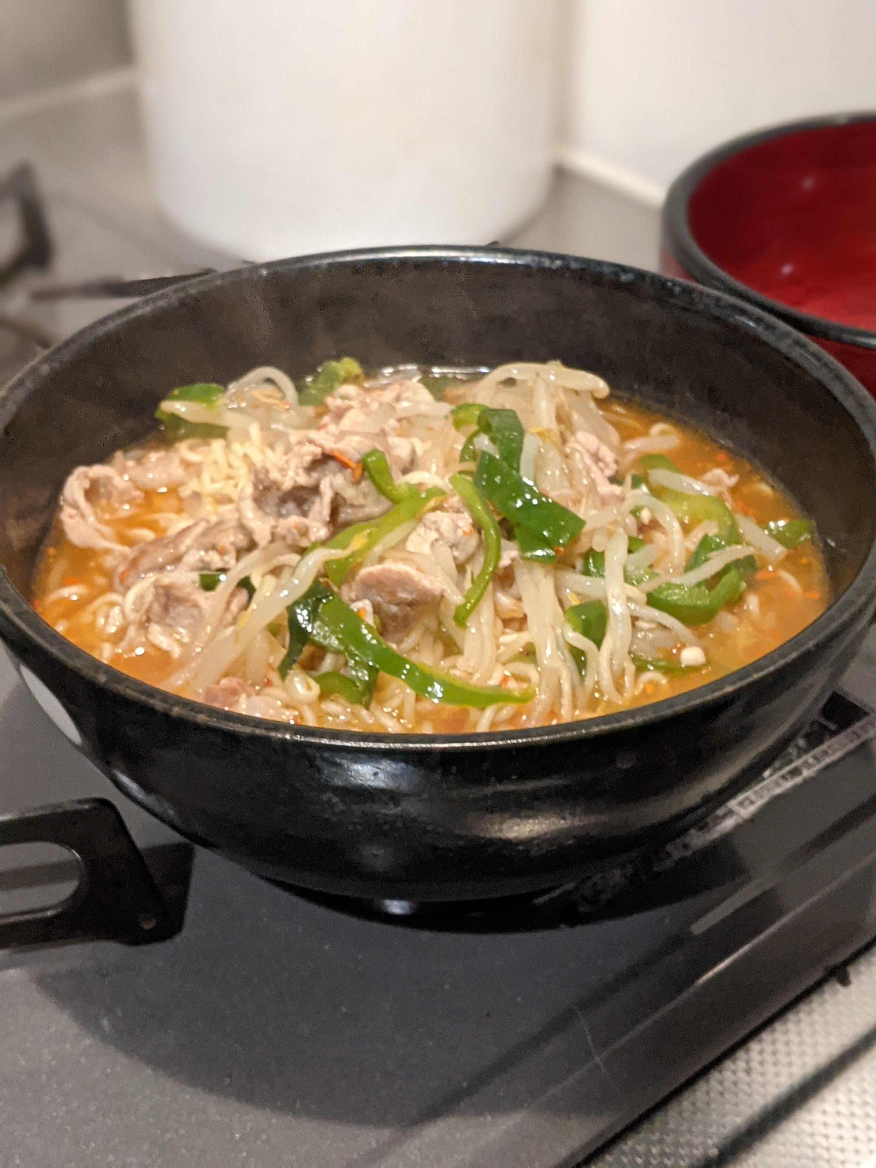 妻が作ってくれた肉もやし炒めをトッピング