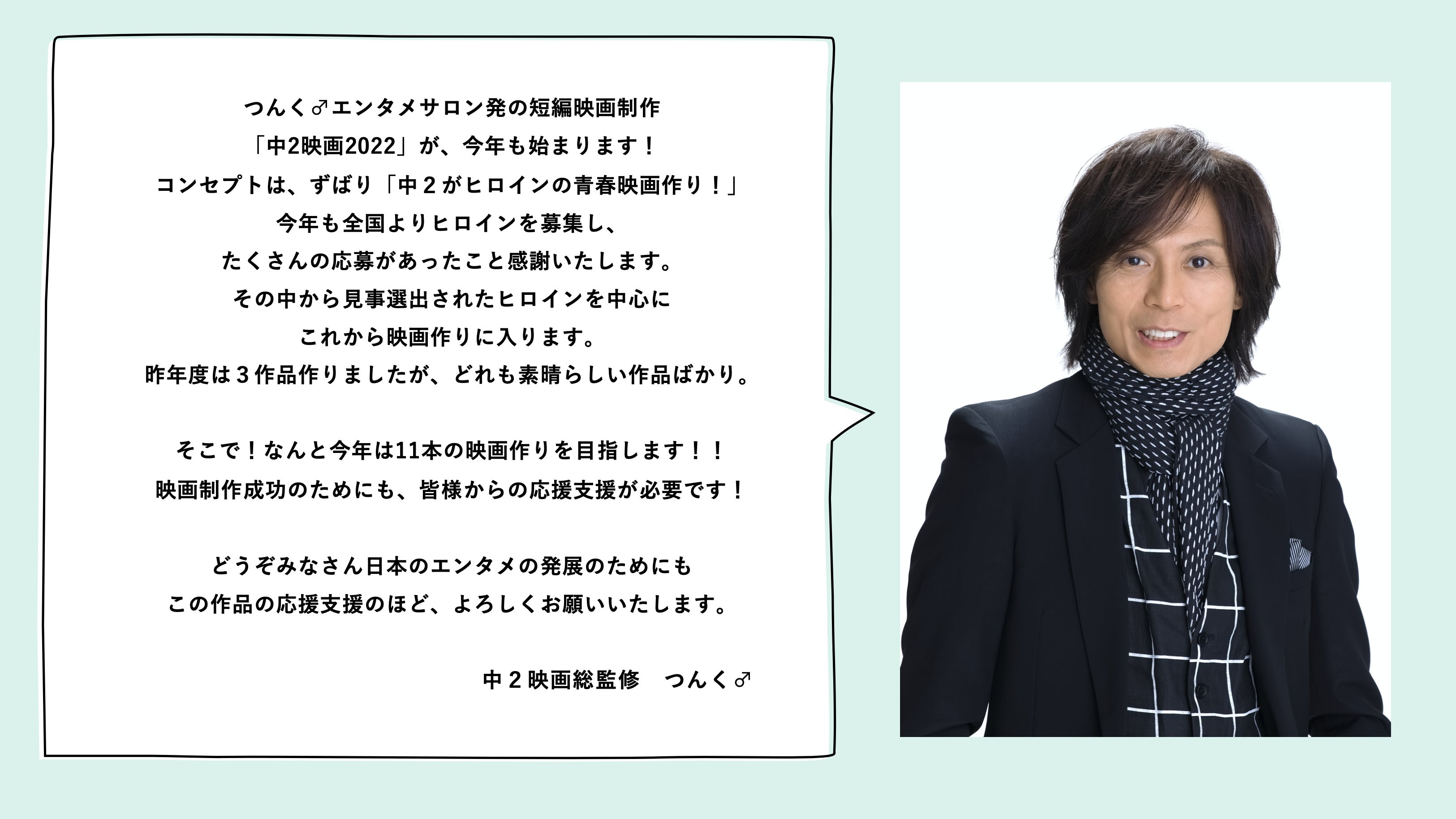 A:つんく♂総監修。「中2」をテーマに青春映画を製作するプロジェクト「中2映画プロジェクト」の第2弾になります。今年は11人の監督と17人のヒロインで11作品を製作致します。加えて、来年夏開催予定の「TOKYO青春映画祭2022」にて公開を予定しております。