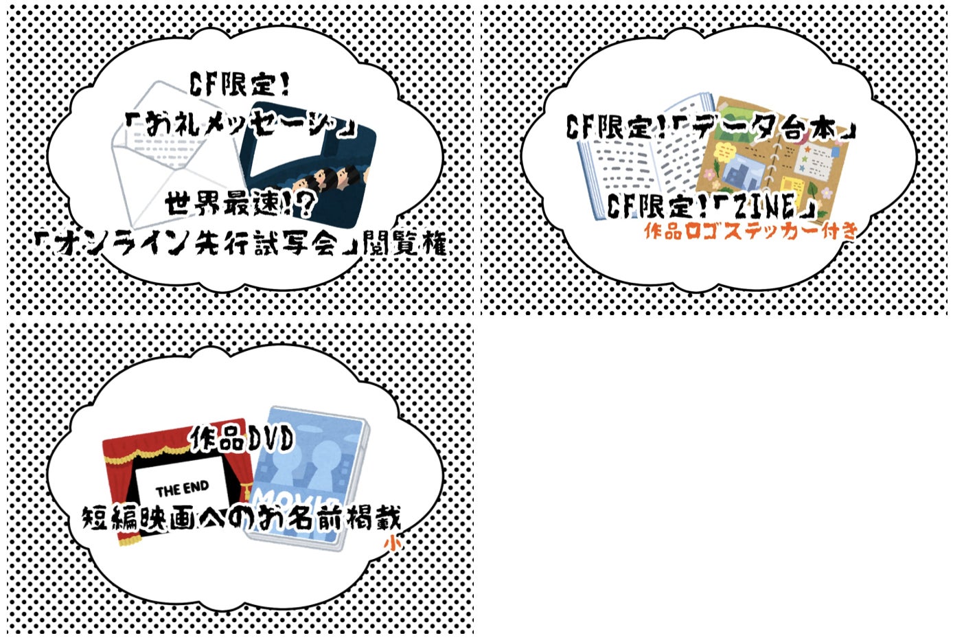 短編映画本編(約30分想定)やメイキング動画(約10分想定)が収録された作品DVDをお送りいたします。