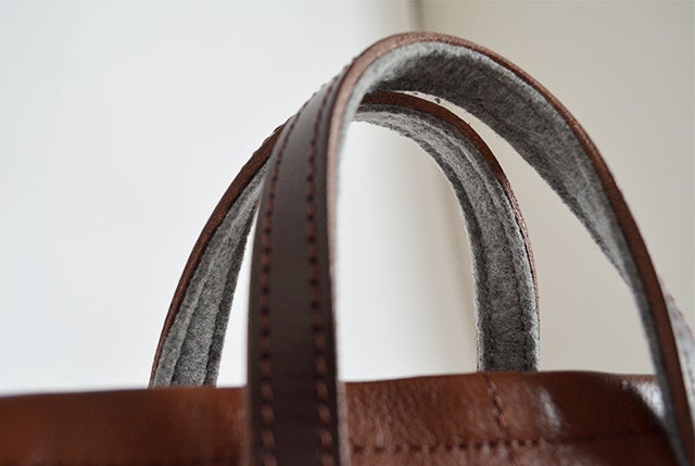 ショートハンドル裏には手に優しい感触のフェルト生地を使用。革のみのハンドルではどうしても長時間持っていると手が痛くなってしまうためフェルト生地をハンドル裏に貼り合わせる事により握り心地よく仕上げました。