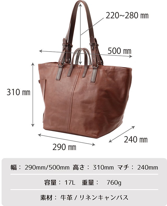 たっぷりとしたマチ幅のあるレザーユーティリティートートの容量は約17L。