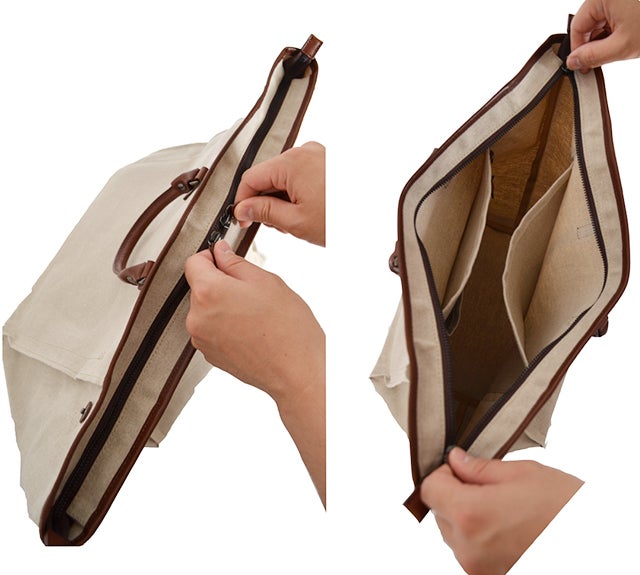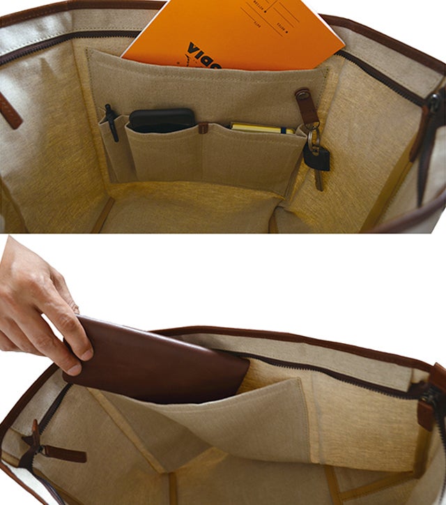 必要最低限の仕分けに便利なオープンポケットが2つと、ファスナーポケットが1つ。貴重品などはファスナーポケットに収納することでセキュリティー面も問題無し。ポケットや機能性を足したい方はオプションのインナーバッグもセットでご用意しております。