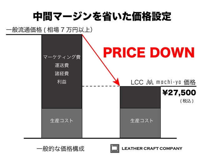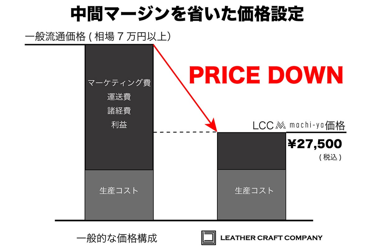 品質やクオリティーを保ち日本製にこだわりながら、メーカー→卸売り→小売→というこれまでの流通形態を取らずに企画製造から物流まで一元化し、中間マージンを削る事で通常の同クオリティー製品よりも流通経費を抑え、メーカーだから出来る手に届きやすい価格で提供いたします。