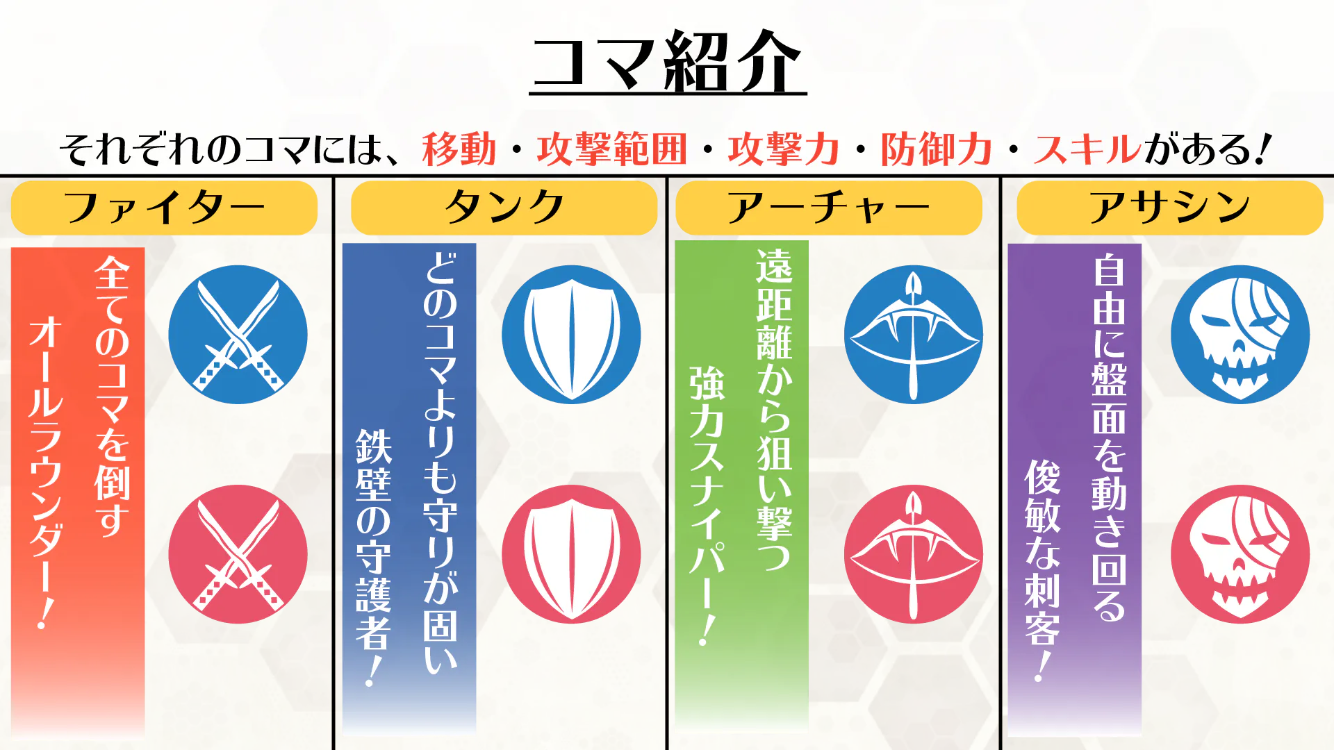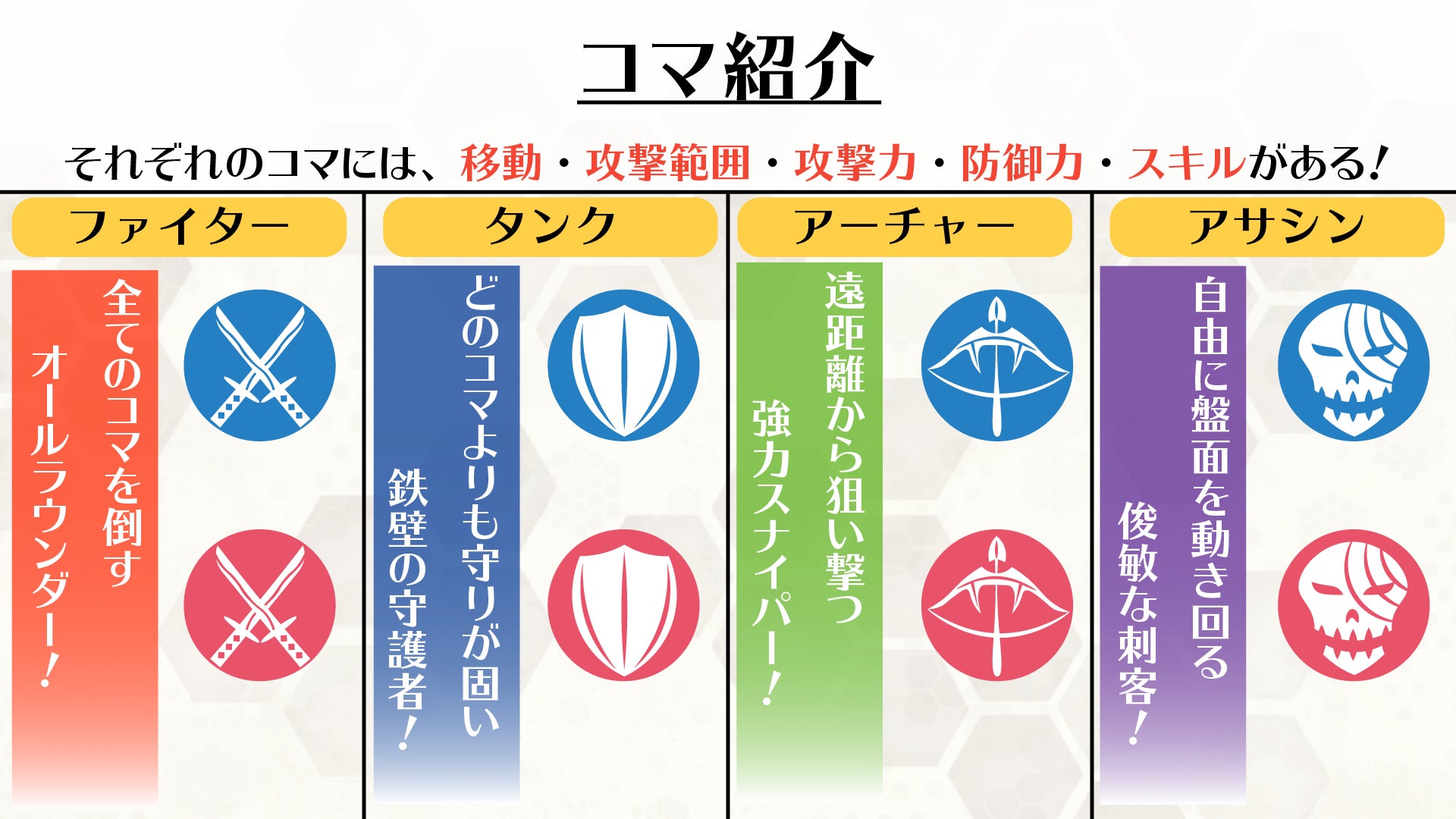 将棋のようにコマを動かし、一発逆転の攻撃とスキルを繰り出せ!そして、一手でも早く相手の旗を奪え!