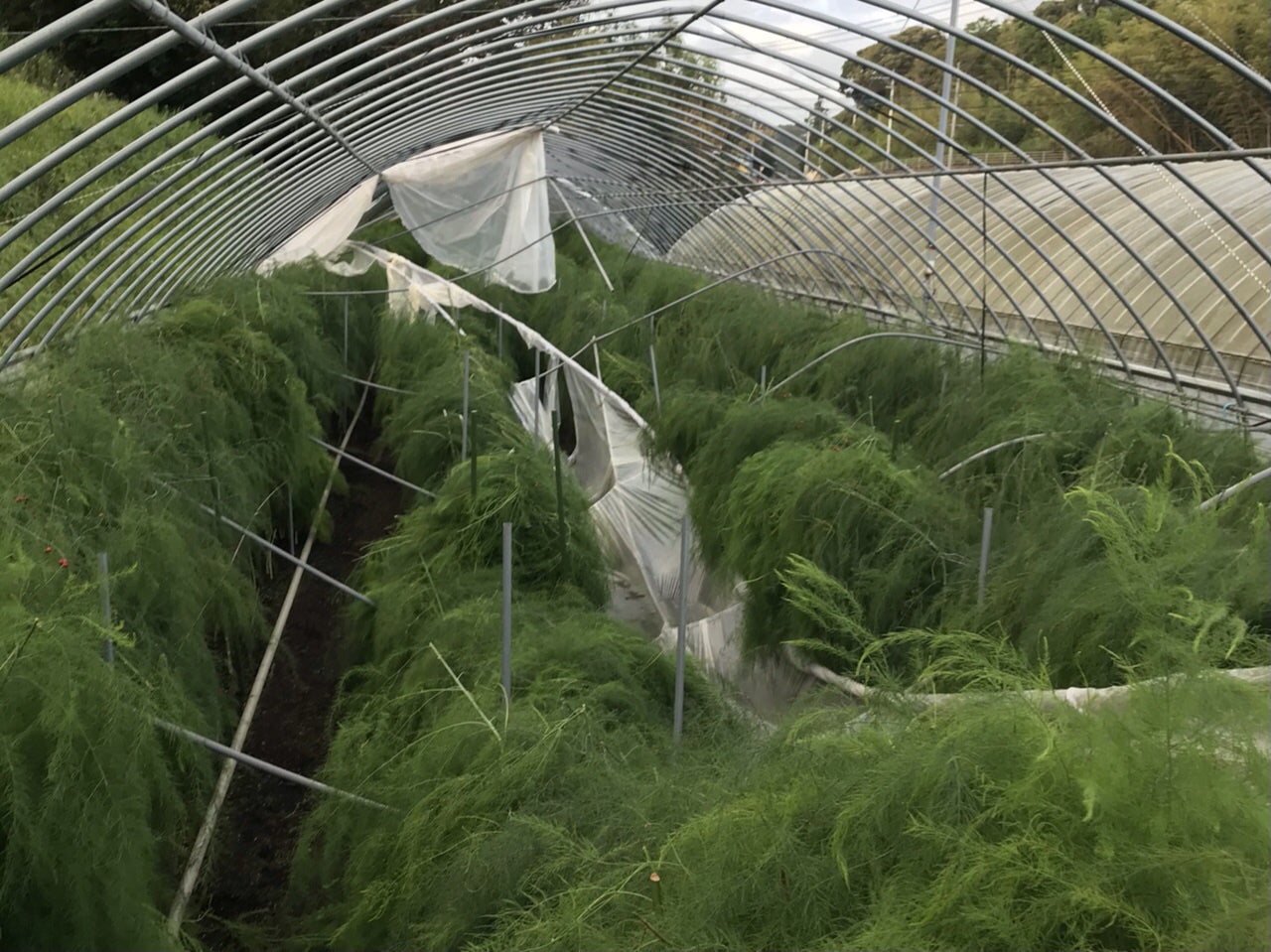 9月17日の台風14号でアスパラハウスが大きな被害にあってしまいました。ビニールハウスの天上部パイプが強風により持ち上げられ破損、持ち上げられたパイプが隣のハウス天上に刺さり破損、内天上部パイプが折れアスパラガスに落下など多大な被害です。