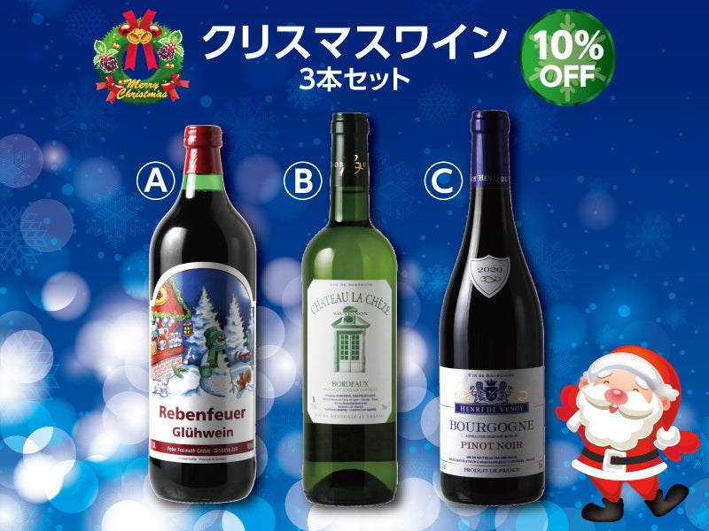 クリスマスにおうちで手軽に楽しめるワイン3本セットです。温めて飲んでおいしいグリューワインと一緒にクリスマスを楽しんでください!