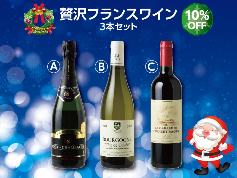 フランスワインの代表産地「シャンパーニュ」「ブルゴーニュ」「ボルドー」の贅沢なワインが楽しめるクリスマスにぴったりな3本セットです。特別にソムリエナイフもプレゼント!