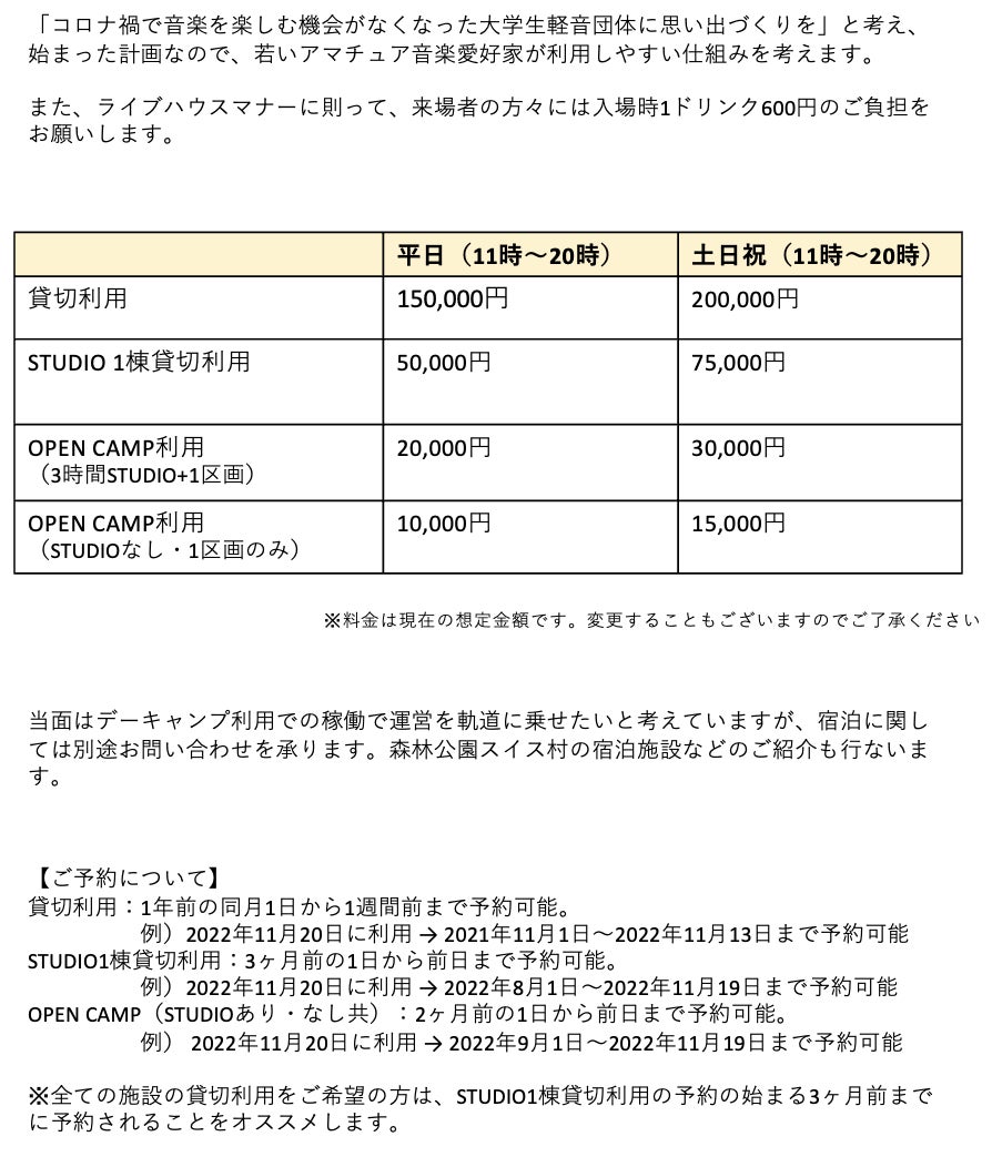 ⼤学軽⾳団体はもちろん、インディーズバンド主催フェス、バンド合宿、プロアーティストを迎えた本格的なフェスにも対応できるような設備を整えていく予定であり、まさに「⾳楽とアウトドアのおいしい関係」を満喫できる施設となります。