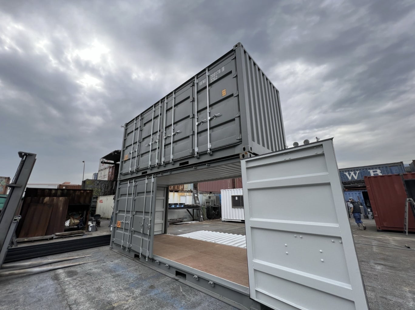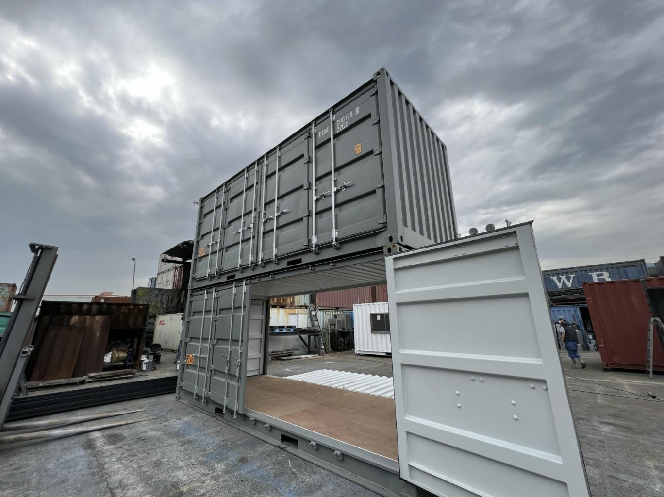 TOPの写真は2段積みになっていますが、STUDIO ONEとTWOのフルサイドオープンの20フィートコンテナ!もう1つの20フィートコンテナと連結させるため、後ろ側はフル開口してもらいました。