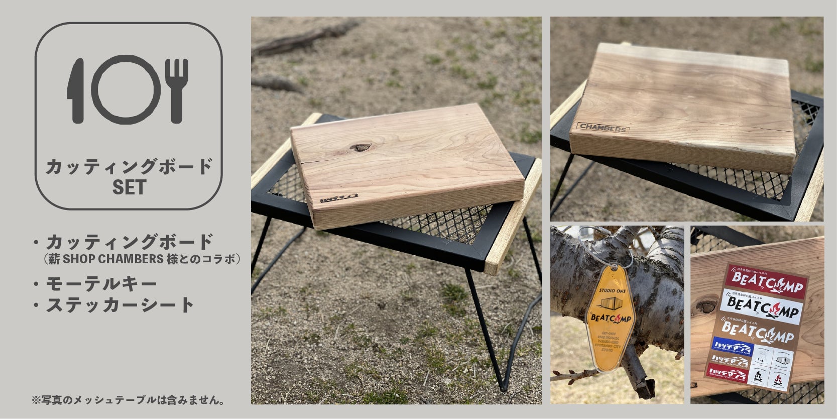 こちらは神戸は長田にある薪ショップ「CHAMBERSさん」の分厚くて無骨なカッティングボードを南出自身がセレクトさせていただきました。カッコいいんですよ!