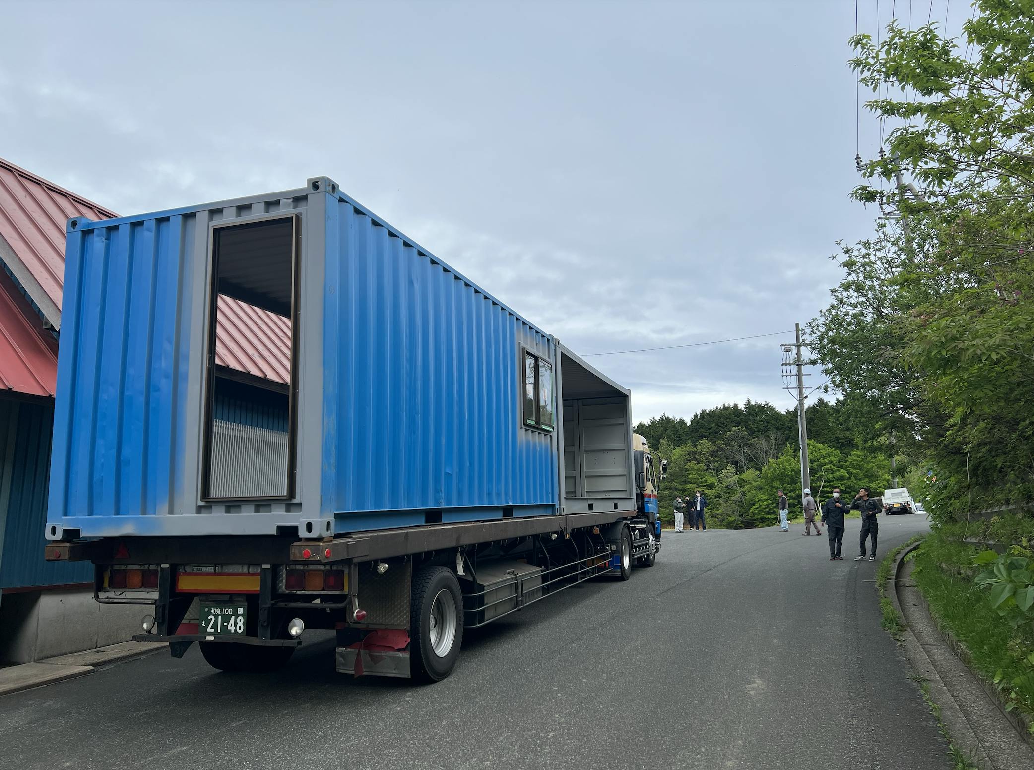 コンテナを運んでくれたトレーラーの運転手さん、3人。4t台車で20フィートコンテナを運んでくれた運転手さん、1人。クレーン車2台を操作してくれた職人さん、2人。コンテナ設置の段取りとクレーンとの連携を担当してくださった職人さん、2人。コンテナの設置や溶接をしてくださった職人さん、3人。もう、皆さん、プロフェッショナルで、、、!