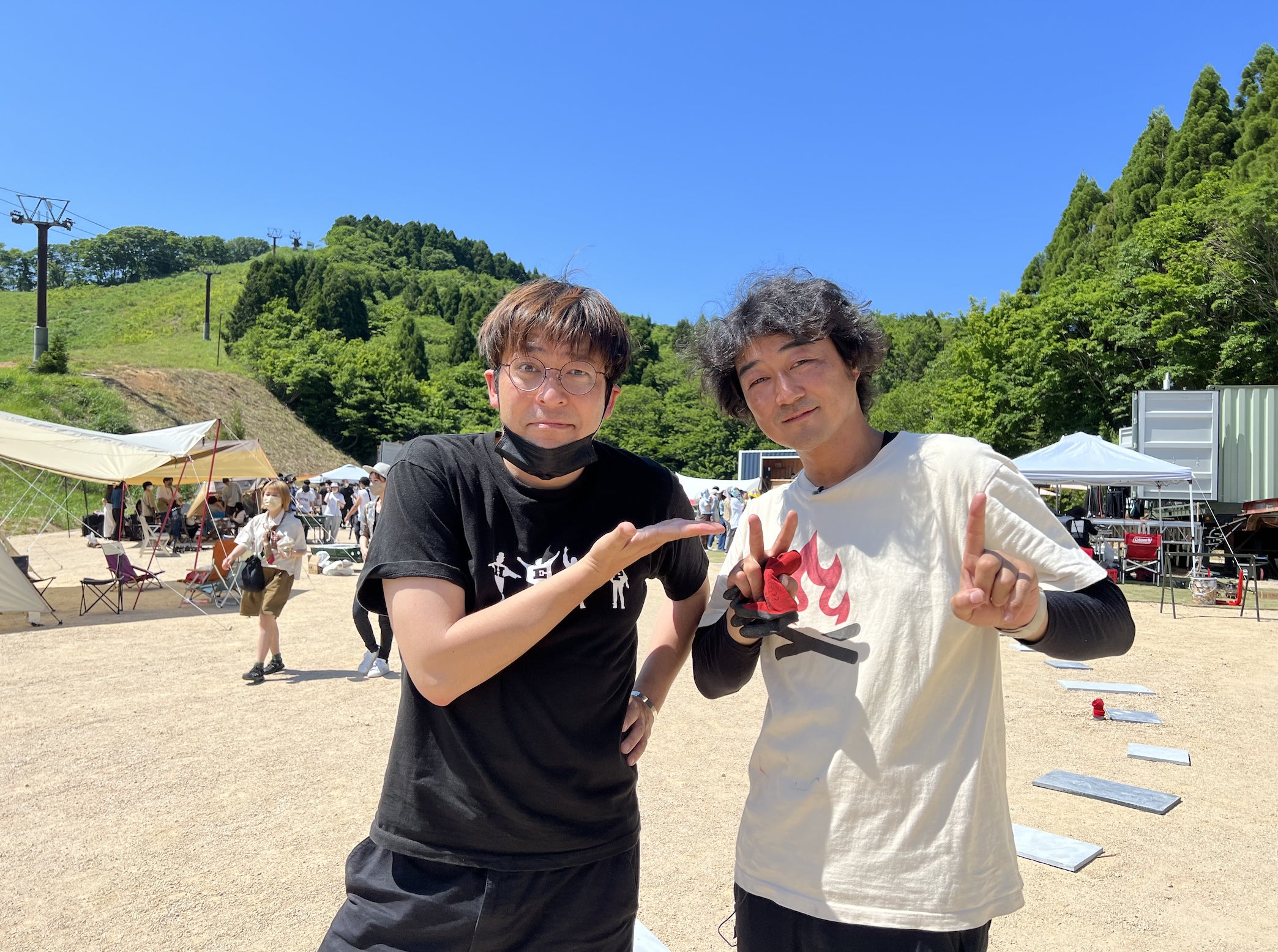 あと、ご持参いただいたタープは譲り合って張っていただけたら、と思います。全員が全員、張っちゃうとライブ見るスペースがなくなっちゃうんで(笑)、、、みんなで1日を一緒に作ろー!という感じがテーマですかね。できる限り「ルール」は作りたくなくって。。。もしかしたら南出からお願いすることもあるかも知れませんが、その時はご対応、お願いいたします!