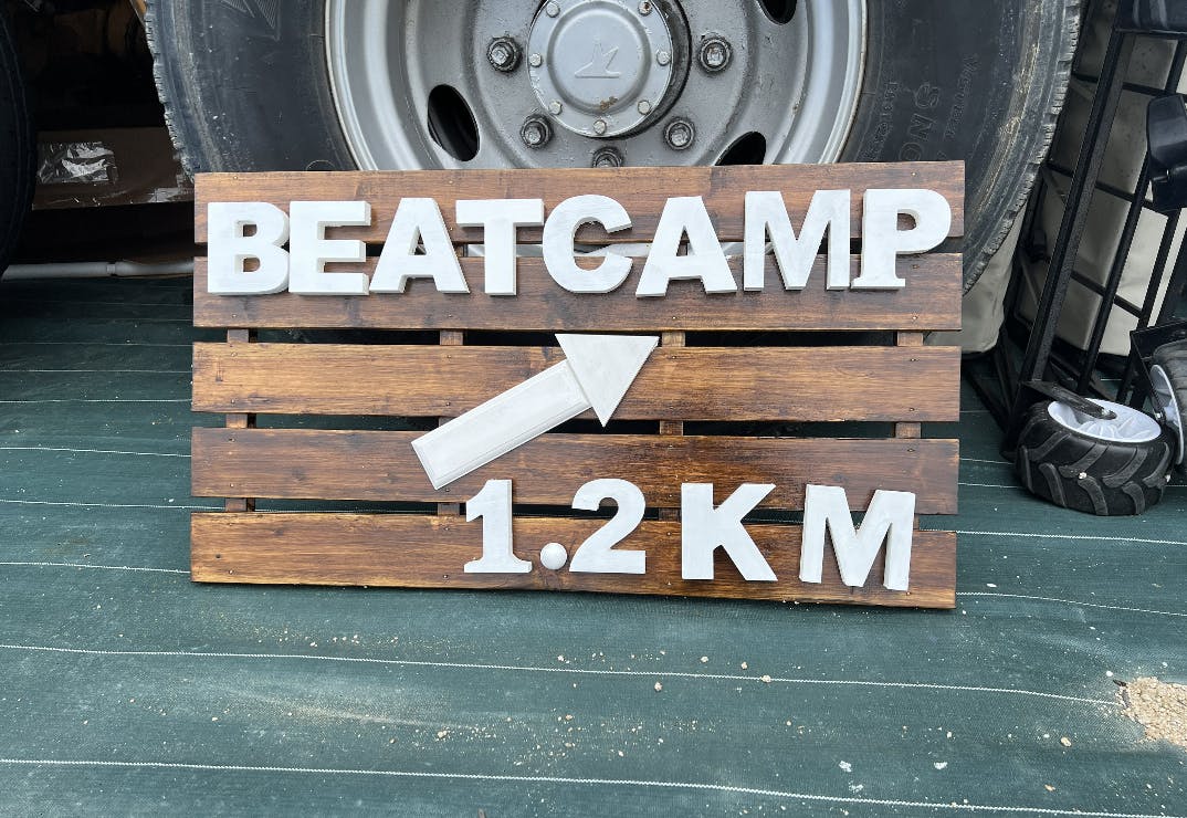 スイス村の総合案内所の看板のところに、「BEATCAMPはあと1.2km先ですよー」という看板を設置しました!BEATCAMPに辿り着く前にスイス村全体の受付があるんですが、皆さん、その先に進むことに不安?を感じられるようで。。。