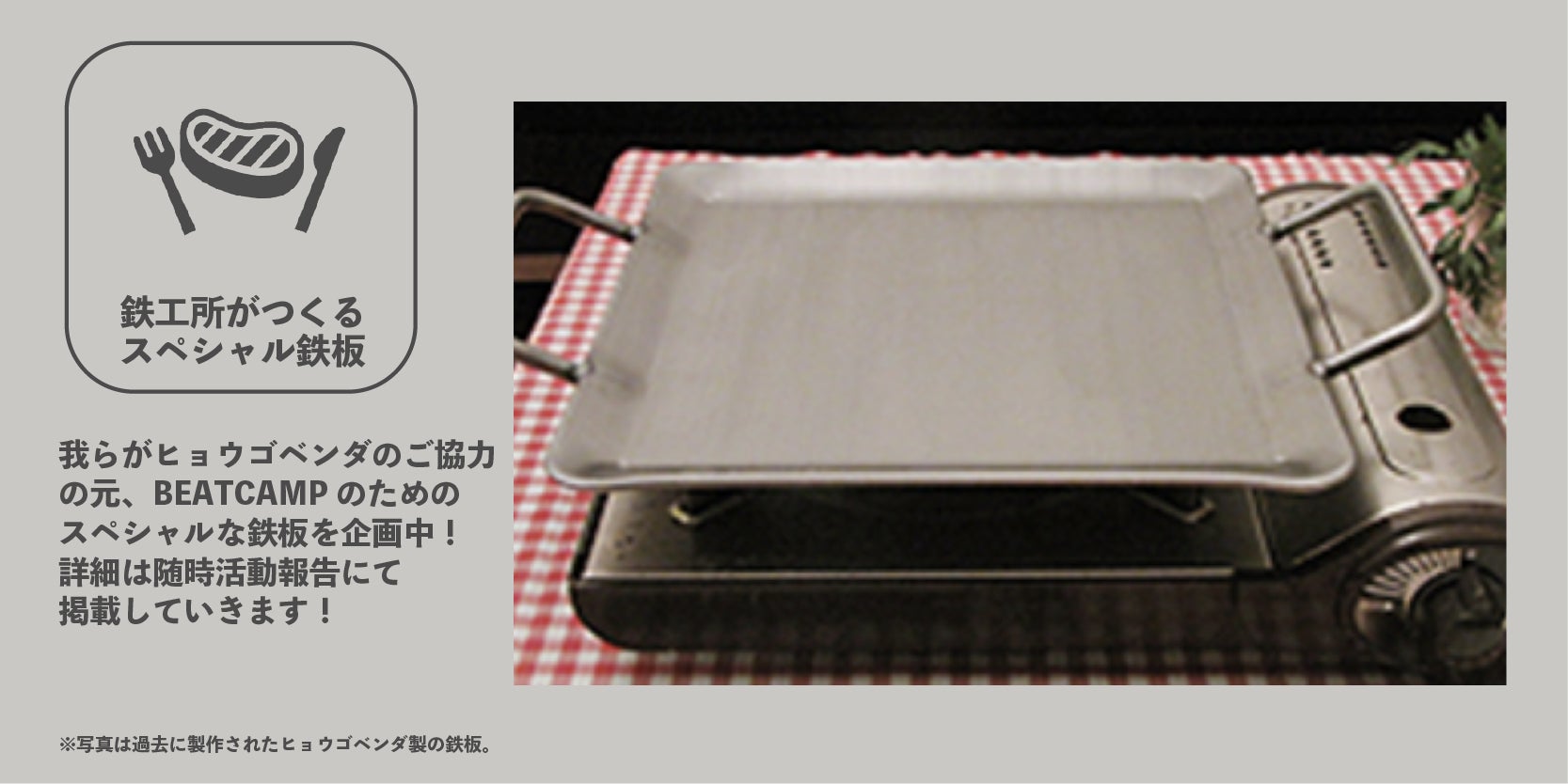 リターン紹介第2弾はこちら!「鉄工所が作るスペシャル鉄板」!https://camp-fire.jp/projects/501420/backers/new?id=795591いつもお世話になっている兵庫ベンダ工業に今回もお世話になりまくってのリターン品をご用意いただきました。完全BEATCAMPオリジナル鉄板です。こちらも色々と仕掛けが明らかになって来てるんです。そちらをご紹介しようかな?と筆を取りました(筆ではない、、、)!試作品はこちら。家庭用カセットコンロにセットして、こんな感じ〜。わかりますかね?鉄板が3段になってる!実はヒョウゴベンダの本丸さんたちとは、神戸三宮にあるジンギスカンのお店によく行くのですが、ジンギスカン鍋の周囲に野菜を置いて、そこにラム肉の脂が落ちていって、野菜が旨くなる!っていう、あの感じ?これを鉄板でも出来ないかなぁ?と話してたんです。ジンギスカン鍋それを具体化してくれたのが、この3段鉄板!一番下には野菜を置いてね、野菜が旨くなるっていう、、、!笑あとはここから取っ手をつけてもらったり、ネームを入れてもらったり、、、で完成となりそうです!イメージはこんな感じかな?取っ手などはちょっと変更あると思いますが!現在13人の方にご支援いただいておりますが、残り17人!ぜひともこの機会に、スペシャル鉄板、よろしくお願い致します!