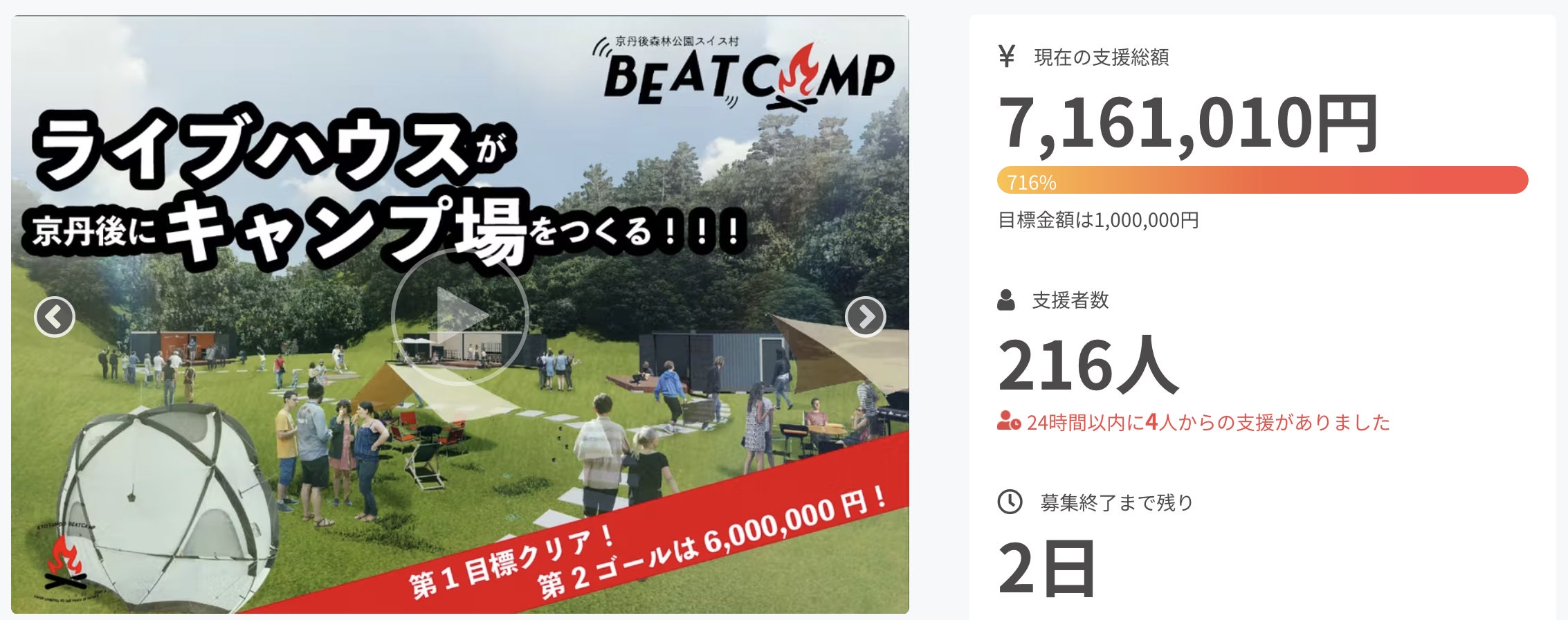 やったーーーーー!BEATCAMPのホームページが出来ましたーーーーー!https://beatcamp-music.com/施設そのものが完成していないので、一旦は1枚もののホームページになりますが、ネット上に「陣地」を獲得した気分で、嬉しい!ずっと「キャンプ場をつくる!!!!」ということにフォーカスしていて、「SNS、あるしな、、、」とホームページ制作については、ズルズルと放っておいてしまった、、、というのが正直なところでした。4月に入り、「あ、どうすんの?」と自分自身に問いかけ、焦り出し、、、今村モータースに相談したのが4/7(木)。今村モータースのホームページや太陽と虎、ワタナベフラワーのホームページを手がけているフィガロウェブの飯田くんと、、、繋いでくれへん?って。もちろん面識はありますし、軽ーくお話ししたこともあったんですが、今村モータースから「やっちんさん(飯田くん)キャンプが好きで、一緒にBEATCAMPに遊びにいこうか、って言ってるんですよー」って聞いて、、、あ、彼にお願いしたいな、、、と思ったっていう経緯。ナチュラルパンチドランカーっていうバンドの元ドラマーで、現在はワタナベフラワーのサポートドラマーであり、キャンプが好き、ウェブが構築できる、、、これは、、、!笑●そして、、、仕事がとても早い!!! クラウドファンディングが終わるまでになんとか、、、ってお願いしてみたんですが、びっくりするくらい早い!!!これって、本当にありがたいこと。ありがとうございます!!!●今はまだ僕らがどうやってキャンプ場を運営していけるのか、不透明なことばかり。この状態でいきなりキャンプのお客さんの予約を取るのは失礼にあたる、、、と思っていて、ライブハウス運営のノウハウだけはしっかりあると思っているので、まずは「あなたもBEATCAMPでフェスを企画してみませんか?」というお問合せフォームは作ってもらいました。もちろん色んなお問合せもお待ちしています!お気軽に是非!7月中には素敵な写真なんかも掲載して、しっかりとしたホームページにしてもらえる予定!どうぞBEATCAMPホームページ、よろしくお願い致します!クラウドファンディング終了まであと5日!もう一度ページをご覧いただき、、、、ご支援、よろしくお願い致します、、、!