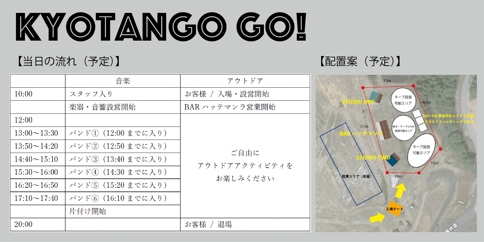 昨今のアウトドアブームの中でも特にキャンプ人気はウィズコロナに於ける新たなエンターテイメントとして受け入れられているように感じます。ただ、音楽をいつでも自由に奏でられるキャンプ場が少ないことに気づき、そして思い至った「音響・照明などのライブハウス的インフラを整えた、いつでも気軽に野外フェスを体感できる施設」をつくりたい!と思いました。密を避けた自然環境の中で音楽を存分に楽しみ、新しい世代が新しい価値観を発見できるような「場づくり」です。(音を出す施設なので「民家から出来るだけ離れた場所」というのが一番大切で重要な条件でした。京丹後市と管理会社の方には歓迎いただいています。)