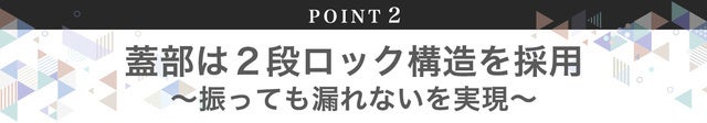 特許を取得している漏れ防止の2段階ロック機能は、任意の圧力と揺れの下で漏れから内容物を防ぐ強力なシールとして力を発揮します。