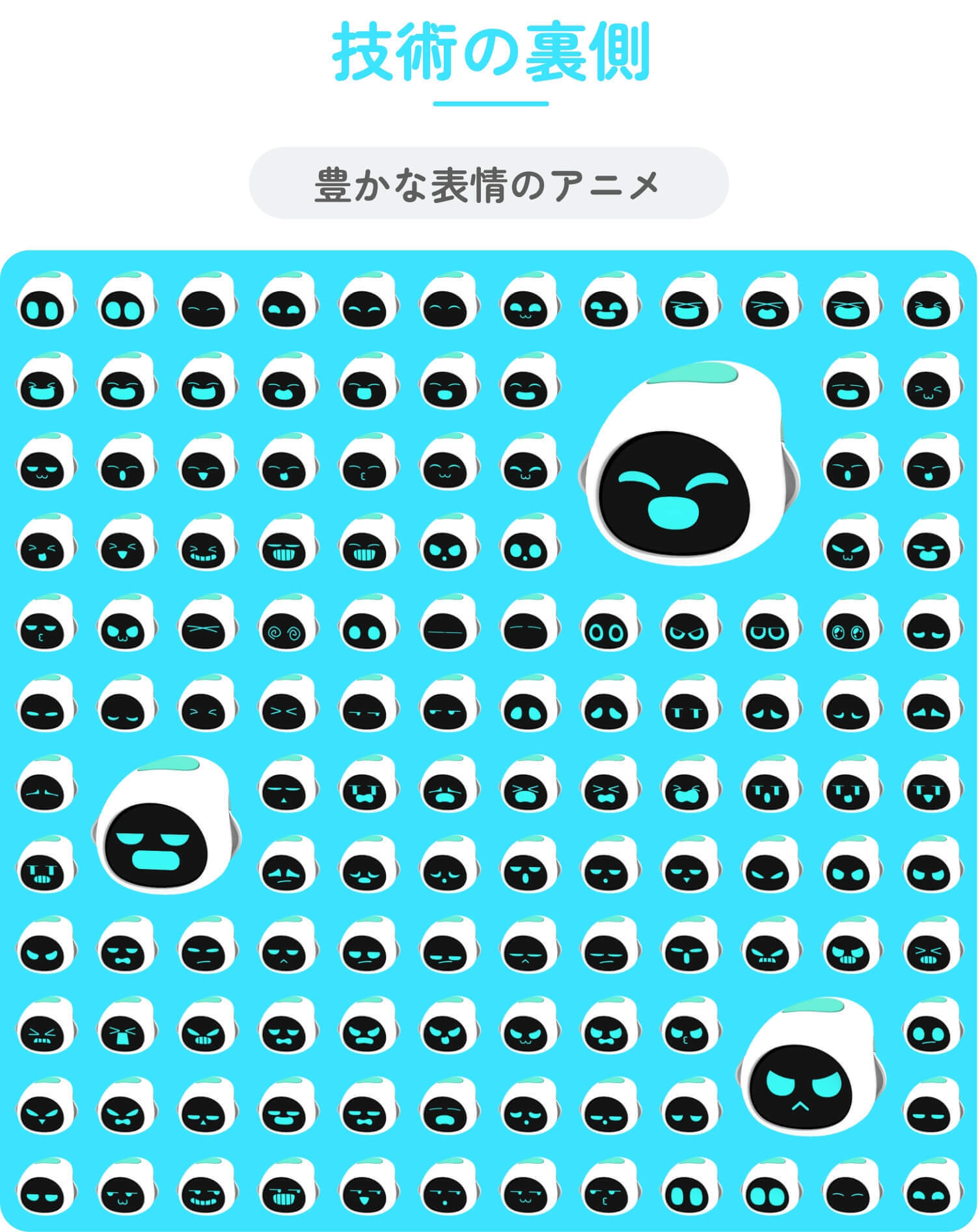 笑う、叫ぶ、泣く、落ち込む、言葉を失う、がっかりする、かわいこぶる、面白がる、罵る、怒るなど、様々な感情をよりリアルに表現するために、豊富な表情システムを構築。ダイナミックなアニメーションと25fpsの有機ELディスプレイ画面により、感情を生き生きとした表現します。