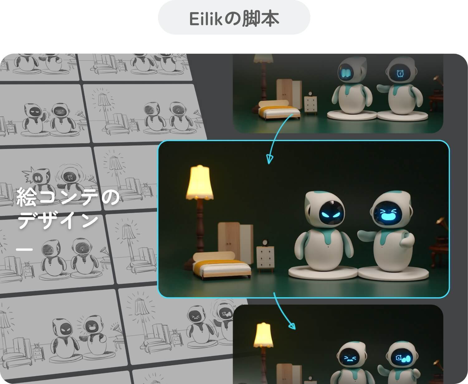 生き生きとした楽しいEilik「アイリック」にするために、社内のアニメーションチームが集結。全ての表情やアクションの裏には優秀な脚本家、作家、アニメーションプロデューサー、声優、ソフトウェアエンジニアが携わっています。