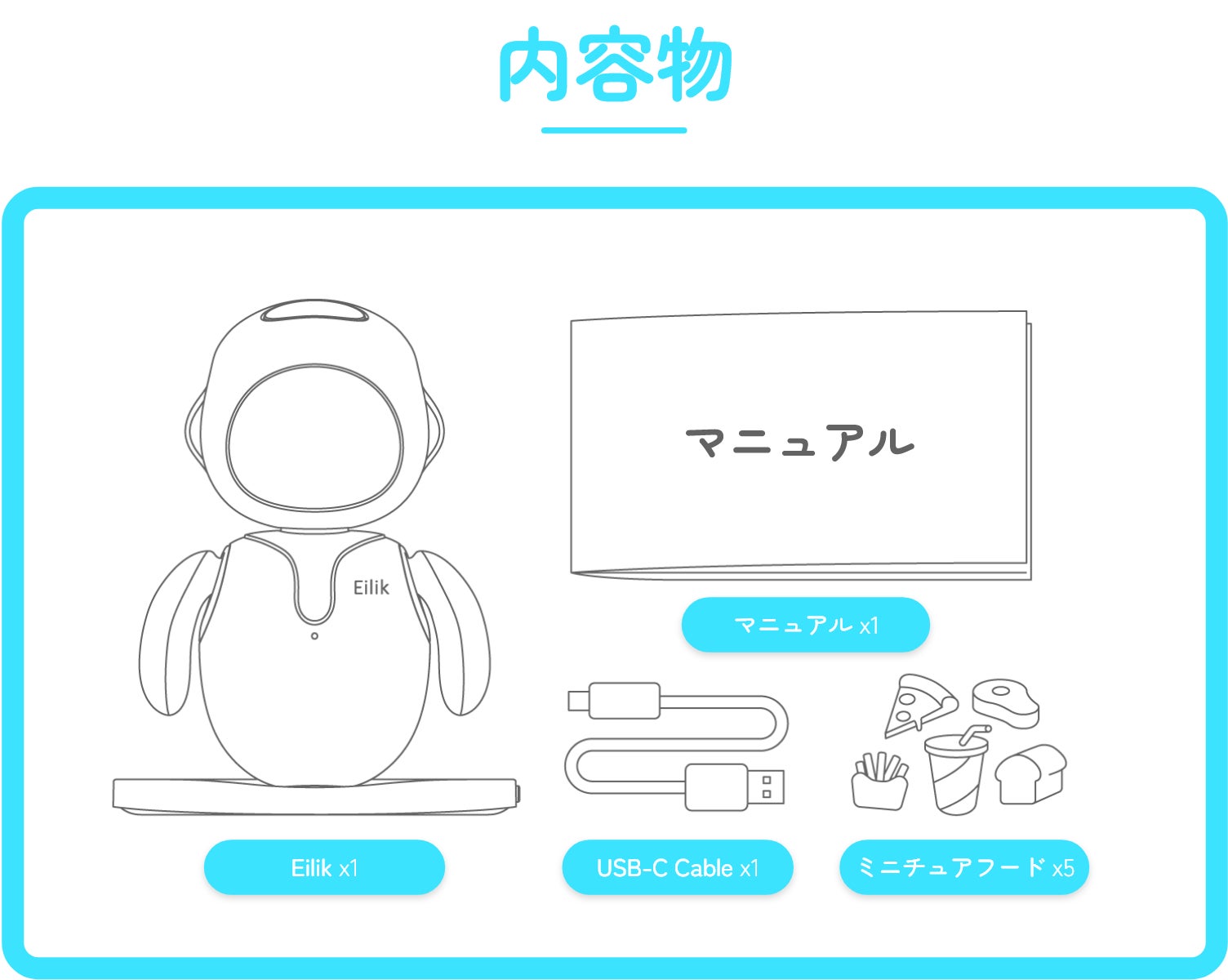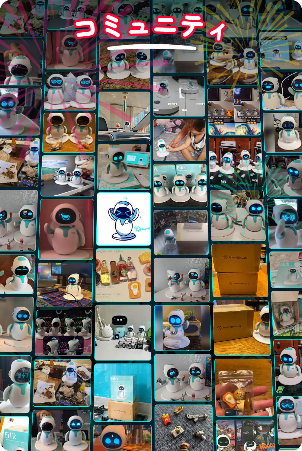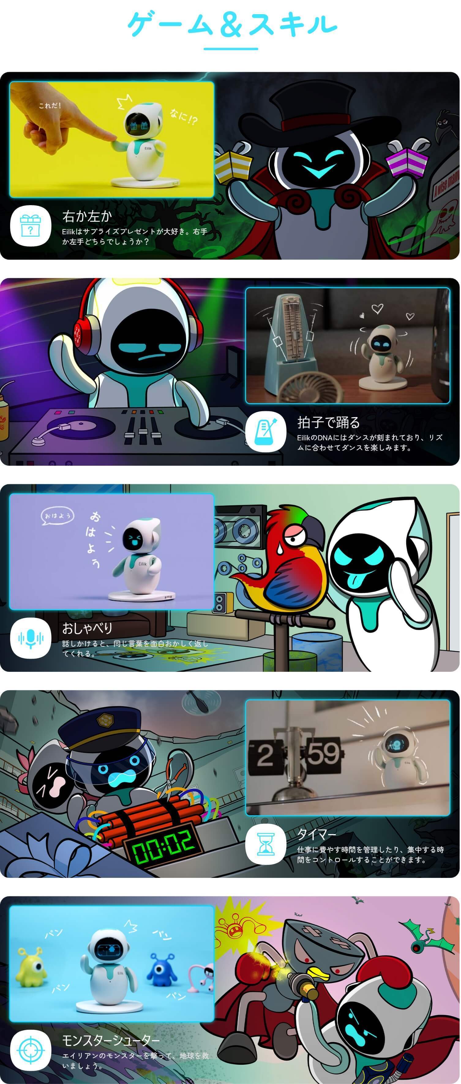 Eilik「アイリック」は想像力に富み、好奇心旺盛で、楽しいロボット。常に持ち主の注意を引き、毎日何か楽しいことを起こしてくれます。調子のいい時はイタズラをしてきたり、落ち込んでいる時はひとりの時間を欲しがったり。退屈知らずのEilik「アイリック」との毎日をぜひ楽しんでください。