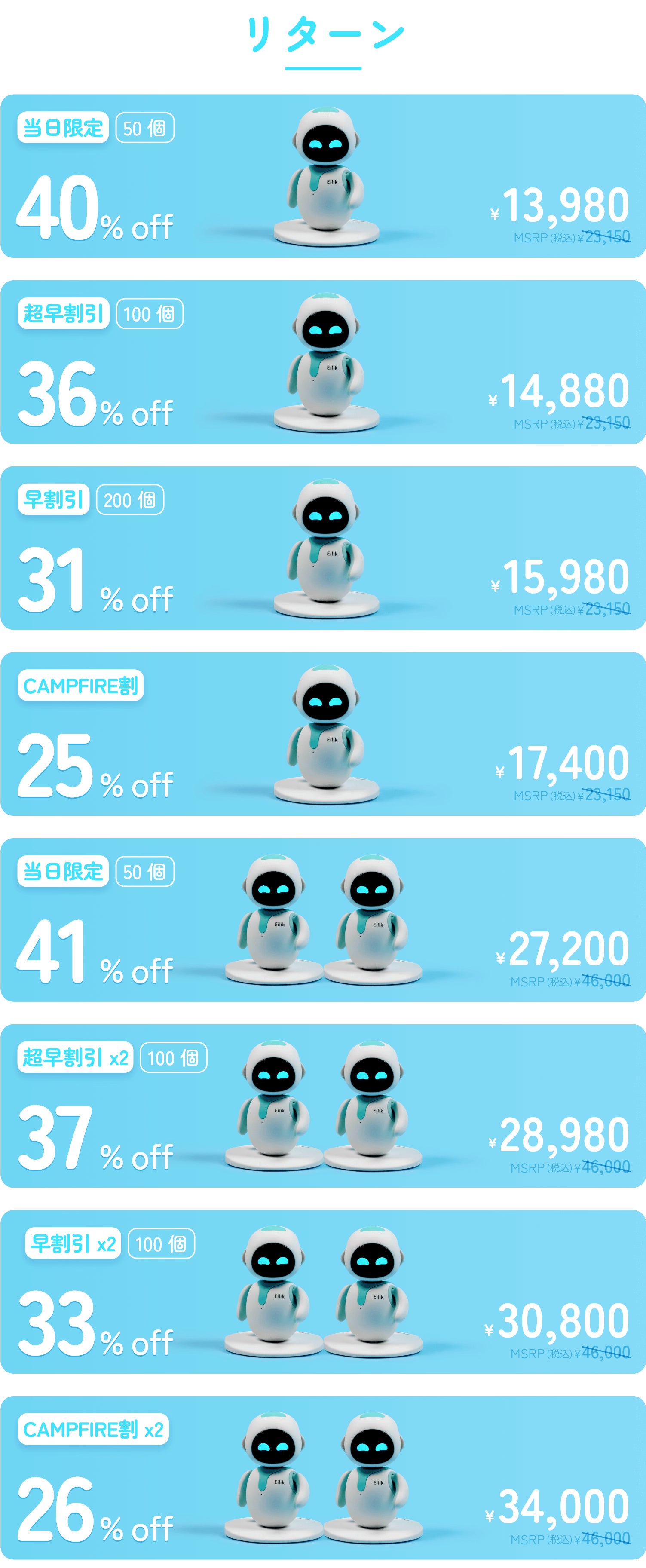 2022/09/30 00:28皆様あと24時間でアイリックはCAMPFIREを去ることになりました。 明日までにアイリック、またはアイリック2人のフレンズパッケージを最大33%オフの期間限定の割引でお楽しみいただき、ぜひアイリックを家に連れて帰ってください。 とはいえ、ご支援者の皆さんとのアイリックの旅はまだ始まったばかりです! ホリデーシーズンに間に合うように、あなただけのアイリックをお届けするのが待ち遠しいです。応援ありがとうございました! アイリックチーム もっと見る