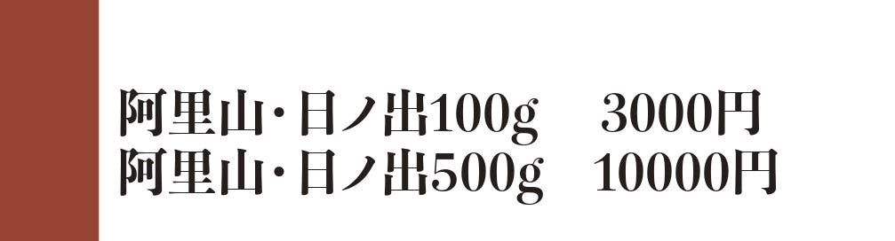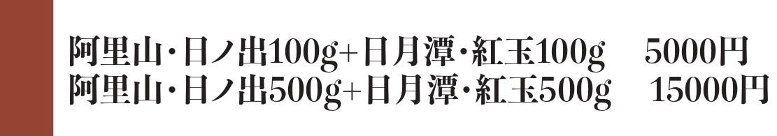 阿里山・日ノ出の一番の特徴はリンゴ、ピーチ、蜜柑などフルーツ風味を持っている。さらにナチュラル製法で豊かなコクと甘みが楽しめる。まるで多彩に変化する雲の隙間から万物を照らすご来光のように、暖かく明るい味です。