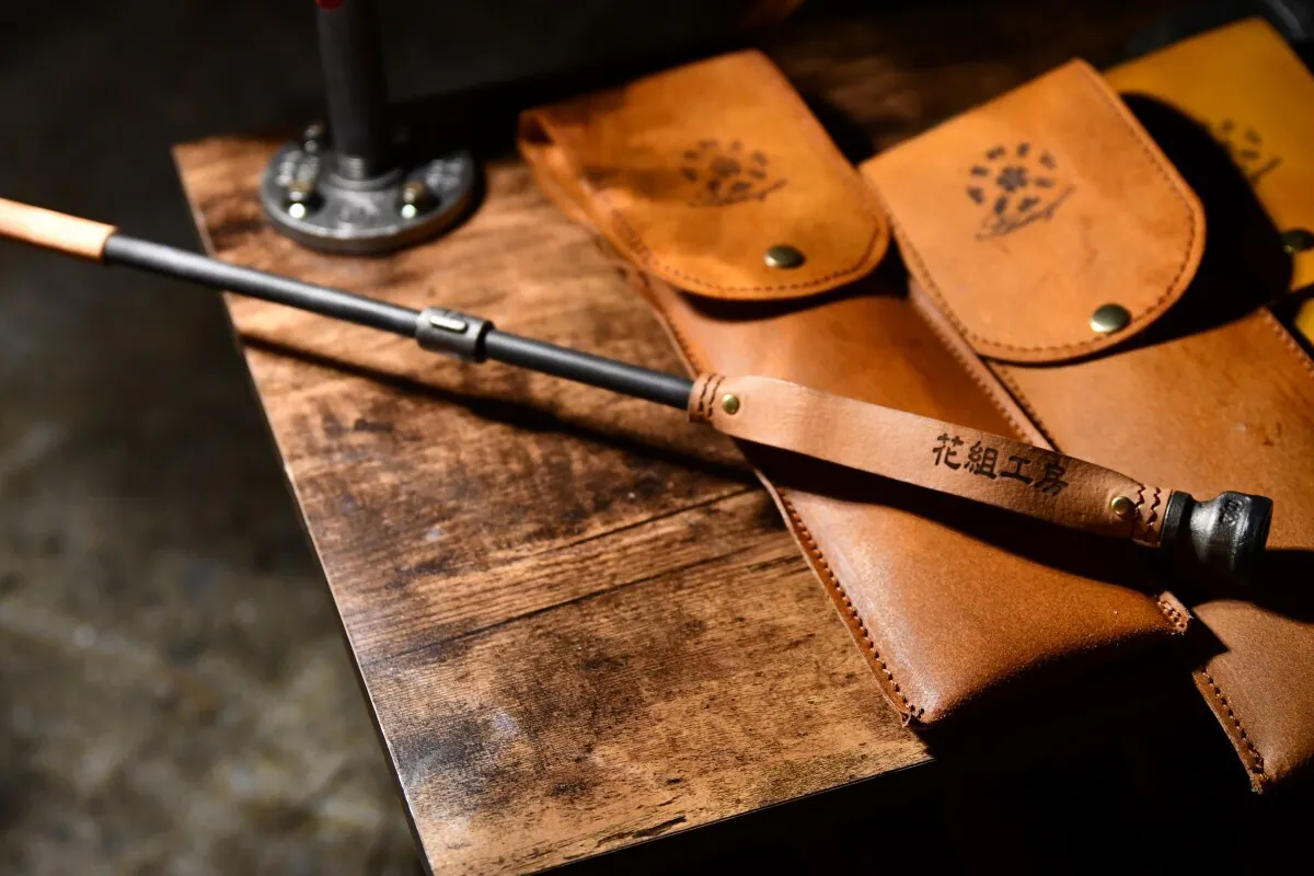収納袋の被せに花組工房のロゴを焼き印であしらっています。