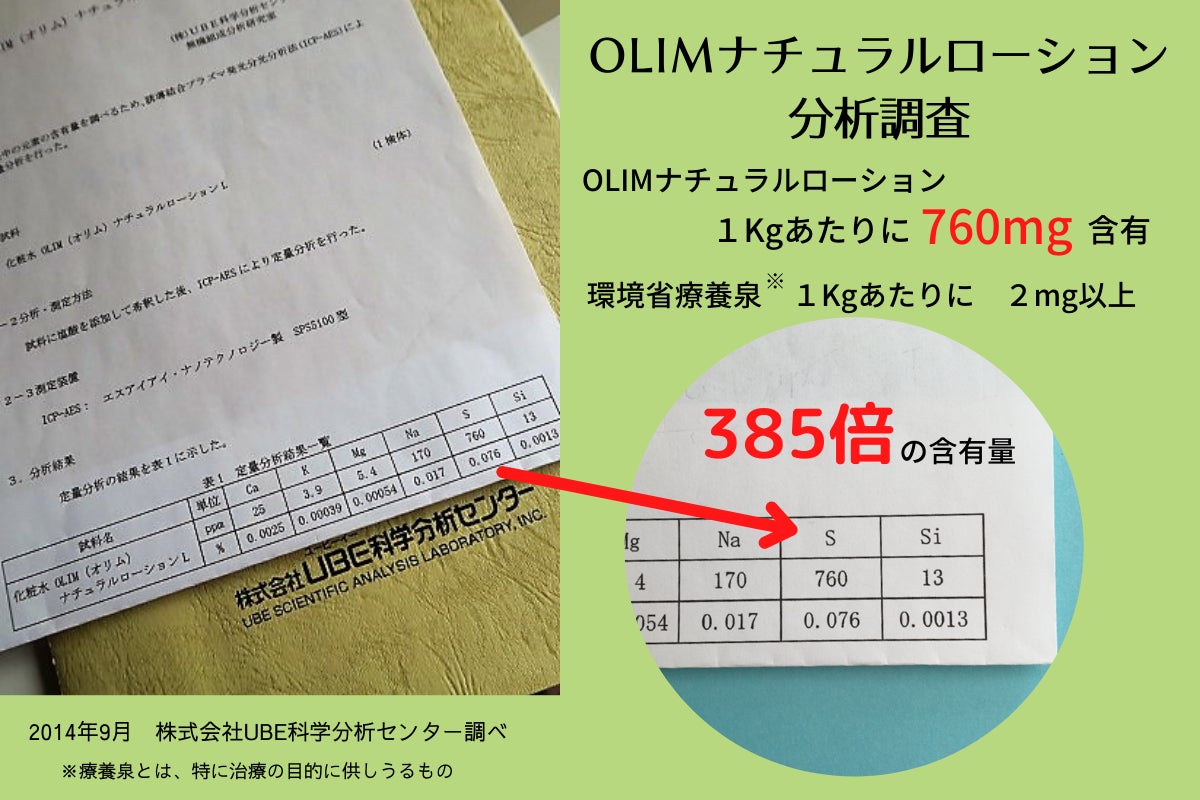 2,化粧水の分析にて、イオウの含有が高いことが分析されています。今後は、さらにそのイオウが肌に対してどのような活性を及ぼしているのか更にその他のOLIM製品の原料となる成分の肌への動きなどの究明をし、その研究結果を公表してまいります。