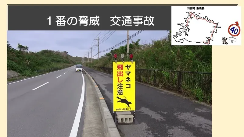 「西表島にはヤマネコの生息地をつっきって1本の県道が走ってるために交通事故が絶えません。
