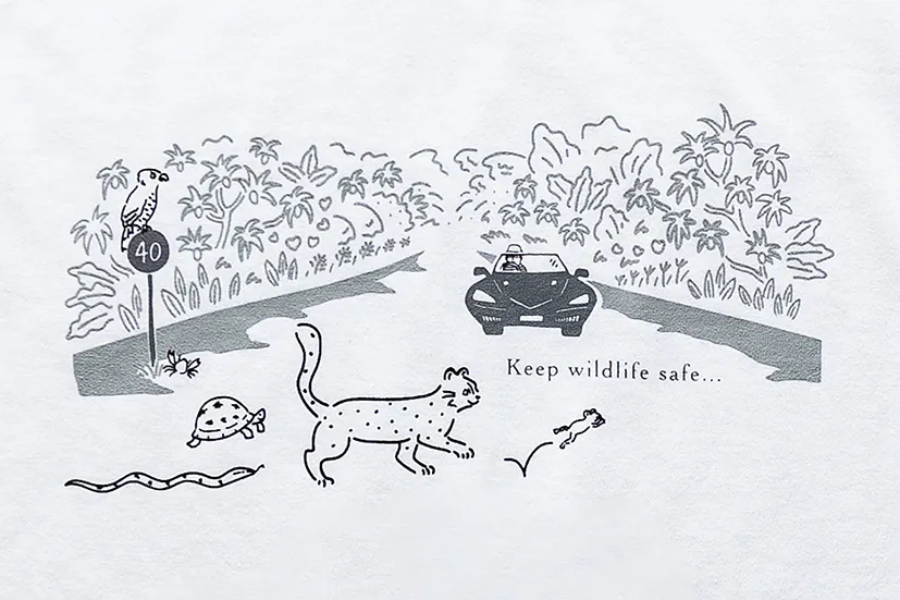 皆で守りたいこと、ヤマネコが飛び出してきた時にすぐ止まれる速度で運転して!をメッセージに西表島と東京で何度も考えたイラストです。