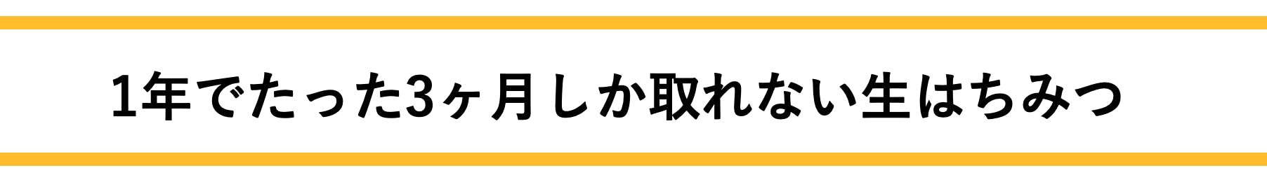 生はちみつは、すべて野生に咲く花の蜜からできています。野生の草花が咲くのは、1年でたった3ヶ月。限られた期間でしか咲かない野生の草花と蜂のペースで熟成させた、栄養価の高い「奇跡の生はちみつ」とも言えるのです。